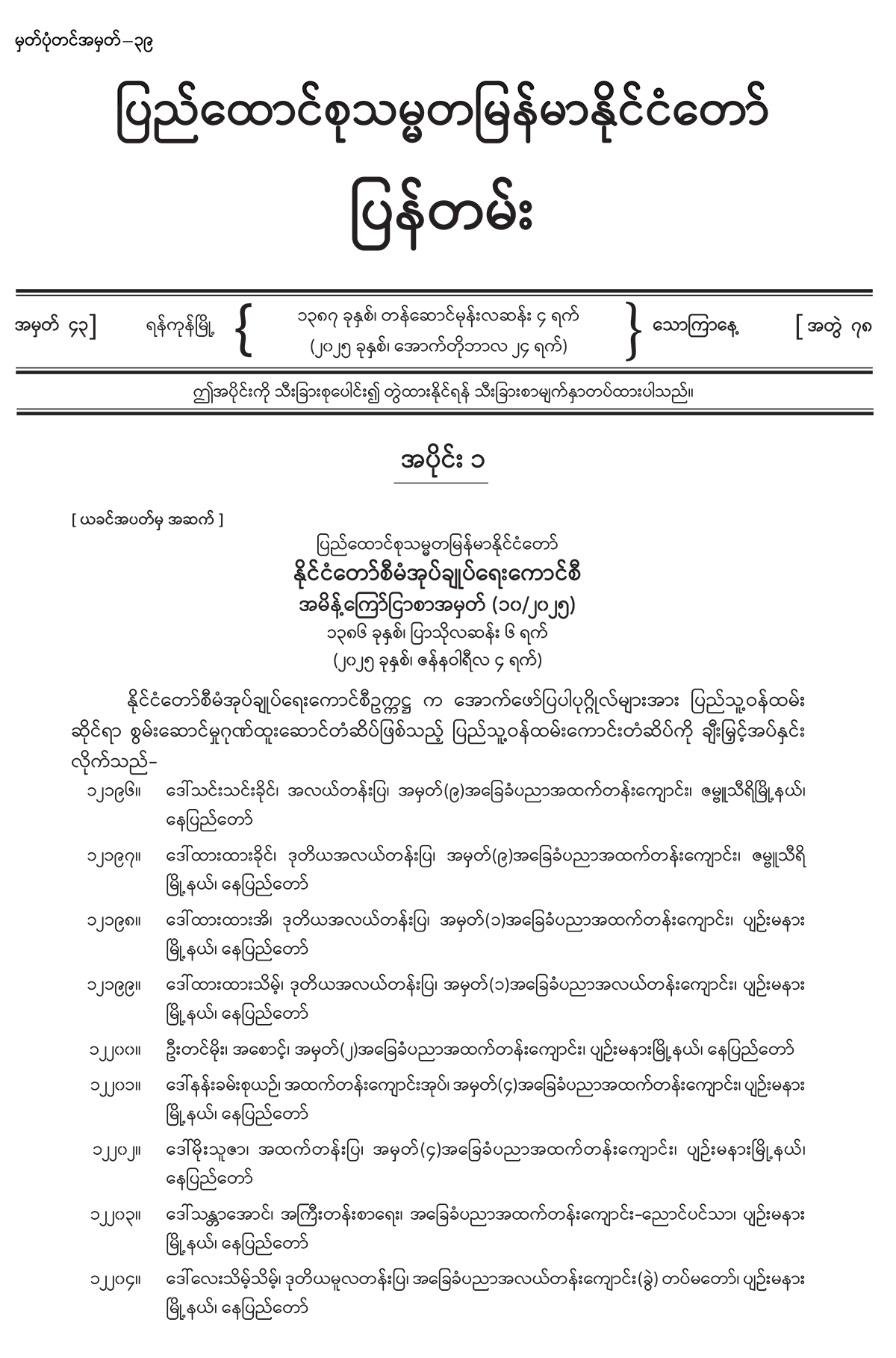 အပိုင်း (၁) တွင် နိုင်ငံတော်စီမံအုပ်ချုပ်ရေးကောင်စီ အမိန့်ကြော်ငြာစာ၊ အမျိုးသားကာကွယ် ရေးနှင့် လုံခြုံရေးကောင်စီရုံး အမိန့်ကြော်ငြာစာ၊ ပြည်ထောင်စုတရားလွှတ်တော်ချုပ် အမိန့်ကြော်ငြာစာ၊ အမျိုးသားအဆင့် လျှပ်စစ်သုံးယာဉ်နှင့် ဆက်စပ်လုပ်ငန်းများ ဖွံ့ဖြိုးတိုးတက်ရေးဦးဆောင်ကော်မတီ အမိန့်ကြော်ငြာစာ၊ အကြမ်းဖက်မှုတိုက်ဖျက်ရေး ဗဟိုအဖွဲ့ အမိန့်ကြော်ငြာစာ၊ အမျိုးသားစီမံကိန်းဝန်ကြီးဌာန အမိန့်ကြော်ငြာစာ၊ ပို့ဆောင် ရေးနှင့် ဆက်သွယ်ရေးဝန်ကြီးဌာန (ဝန်ကြီးရုံး) အမိန့်ကြော်ငြာစာ၊ ဘဏ္ဍာရေးနှင့် အခွန်ဝန်ကြီးဌာန အမိန့်ကြော်ငြာစာ၊ ပြည်ထဲရေးဝန်ကြီးဌာန အမိန့်ကြော်ငြာစာ၊ ပြန်ကြားရေးဝန်ကြီးဌာန အမိန့်ကြော်ငြာစာ၊ သာသနာရေးနှင့် ယဉ်ကျေးမှုဝန်ကြီးဌာန (ဝန်ကြီးရုံး) အမိန့်ကြော်ငြာစာ၊ စိုက်ပျိုးရေး၊ မွေးမြူရေးနှင့် ဆည်မြောင်းဝန်ကြီးဌာန (ပြည်ထောင်စုဝန်ကြီးရုံး) အမိန့်ကြော်ငြာစာ၊ စီးပွားရေးနှင့် ကူးသန်းရောင်းဝယ်ရေး ဝန်ကြီးဌာန (ပြည်ထောင်စုဝန်ကြီးရုံး) အမိန့်ကြော်ငြာစာ၊ ပညာရေးဝန်ကြီးဌာန (ဝန်ကြီးရုံး) အမိန့်ကြော်ငြာစာ၊ သိပ္ပံနှင့် နည်းပညာဝန်ကြီးဌာန (ဝန်ကြီးရုံး) အမိန့်ကြော်ငြာစာ၊ ဟိုတယ်နှင့် ခရီးသွားလာရေးဝန်ကြီးဌာန (ဝန်ကြီးရုံး) အမိန့်ကြော်ငြာစာ၊ ဆောက်လုပ်ရေး ဝန်ကြီးဌာန အမိန့်ကြော်ငြာစာ၊ မြန်မာနိုင်ငံတော်ဗဟိုဘဏ် အမိန့်ကြော်ငြာစာတို့ ပါဝင်ပါ သည်။