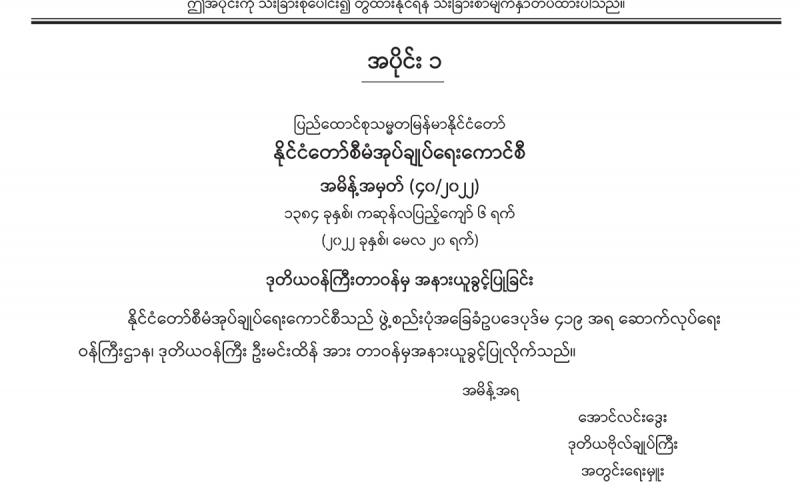 အပိုင်း (၁) တွင်  နိုင်ငံတော်စီမံအုပ်ချုပ်ရေးကောင်စီ အမိန့်ကြော်ငြာစာ၊ ပြည်ထောင်စုတရားလွှတ်တော် ချုပ် အမိန့်ကြော်ငြာစာ၊ နိုင်ငံတော်ဖွဲ့စည်းပုံ အခြေခံဥပဒေဆိုင်ရာခုံရုံး အမိန့်ကြော်ငြာစာ၊ ပြည်ထောင်စု ရွေးကောက်ပွဲကော်မရှင် အမိန့်ကြော်ငြာစာ၊ အဂတိလိုက်စားမှု တိုက်ဖျက်ရေးကော်မရှင် အမိန့်ကြော်ငြာစာ၊ အမျိုးသားသဘာဝအန္တရာယ်ဆိုင်ရာစီမံခန့်ခွဲမှုကော်မတီ အမိန့်ကြော်ငြာစာ၊ ခရီးသွားလုပ်ငန်း ကော်မတီ အမိန့်ကြော်ငြာစာ၊ အမျိုးသားစံချိန်စံညွှန်းကော်မတီ အမိန့်ကြော်ငြာစာ၊ ပြည်ထောင်စုဥပဒေ ဆိုင်ရာအထောက်အကူပေးရေးအဖွဲ့ အမိန့်ကြော်ငြာစာ၊ ပြည်ထဲရေးဝန်ကြီးဌာန (ဝန်ကြီးရုံး) အမိန့် ကြော်ငြာစာ၊ စီမံကိန်းနှင့်ဘဏ္ဍာရေးဝန်ကြီးဌာန (ပြည်ထောင်စုဝန်ကြီးရုံး) အမိန့်ကြော်ငြာစာ၊ ရင်းနှီး မြှုပ်နှံမှုနှင့် နိုင်ငံခြားစီးပွားဆက်သွယ်ရေးဝန်ကြီးဌာန် (ပြည်ထောင်စုဝန်ကြီးရုံး) အမိန့်ကြော်ငြာစာ၊ စိုက်ပျိုးရေး၊ မွေးမြူရေးနှင့် ဆည်မြောင်းဝန်ကြီးဌာန (ပြည်ထောင်စုဝန်ကြီးရုံး) အမိန့်ကြော်ငြာစာ၊ မြေလွတ်၊ မြေလပ်နှင့်မြေရိုင်းများ စီမံခန့်ခွဲရေးဗဟိုကော်မတီ အမိန့်ကြော်ငြာစာ၊ ပို့ဆော¬င်ရေးနှင့် ဆက်သွယ်ရေးဝန်ကြီးဌာန (ဝန်ကြီးရုံး) အမိန့်ကြော်ငြာစာ၊ သယံဇာတနှင့် သဘာဝပတ်ဝန်းကျင် ထိန်းသိမ်းရေးဝန်ကြီးဌာန (ပြည်ထောင်စုဝန်ကြီးရုံး) လျှပ်စစ်စွမ်းအားဝန်ကြီးဌာန အမိန့်ကြော်ငြာစာ၊ စီးပွားရေးနှင့်ကူးသန်းရောင်းဝယ်ရေးဝန်ကြီးဌာန (ဝန်ကြီးရုံး) အမိန့်ကြော်ငြာစာ၊ ဆောက်လုပ်ရေးဝန်ကြီး ဌာန (ပြည်ထောင်စုဝန်ကြီးရုံး) အမိန့်ကြော်ငြာစာ၊ လူမှုကာကွယ်စောင့်ရှောက်ရေးဆိုင်ရာ အမျိုးသား ကော်မတီ အမိန့်ကြော်ငြာစာ၊ တိုင်းရင်းသားလူမျိုးများရေးရာဝန်ကြီးဌာန (ပြည်ထောင်စုဝန်ကြီးရုံး) အမိန့် ကြော်ငြာစာ၊ ရန်ကုန်မြို့တော်စည်ပင်သာယာရေးကော်မတီ အမိန့်ကြော်ငြာစာ၊