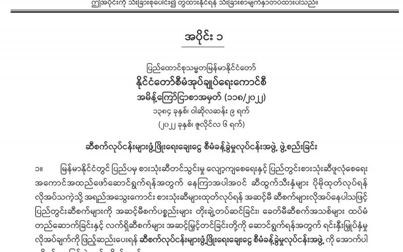 အပိုင်း (၁) တွင် နိုင်ငံတော်စီမံအုပ်ချုပ်ရေးကောင်စီ အမိန့်ကြော်ငြာစာ၊ ပြည်ထောင်စုတရားလွှတ်တော် ချုပ် အမိန့်ကြော်ငြာစာ၊ မြန်မာနိုင်ငံစားသုံးသူကာကွယ်ရေးကော်မရှင် အမိန့်ကြော်ငြာစာ၊ ခရီးသွားလုပ်ငန်းကော်မတီ အမိန့်ကြော်ငြာစာ၊ ပတ်ဝန်းကျင်ထိန်းသိမ်းရေးကော်မတီ အမိန့်ကြော်ငြာစာ၊ (၂၃) ကြိမ်မြောက် မြန်မာ့ရိုးရာယဉ်ကျေးမှု အဆို၊ အက၊ အရေး၊ အတီး ပြိုင်ပွဲကျင်းပရေးလုပ်ငန်း ကော်မတီ အမိန့်ကြော်ငြာစာ၊ ပြည်ထဲရေးဝန်ကြီးဌာန (ဝန်ကြီးရုံး) အမိန့်ကြော်ငြာစာ၊ စီမံကိန်းနှင့် ဘဏ္ဍာရေး ဝန်ကြီးဌာန အမိန့်ကြော်ငြာစာ၊ သာသနာရေးနှင့် ယဉ်ကျေးမှုဝန်ကြီးဌာန (ဝန်ကြီးရုံး) အမိန့်ကြော်ငြာစာ၊ ပို့ဆောင်ရေးနှင့် ဆက်သွယ်ရေးဝန်ကြီးဌာန (ဝန်ကြီးရုံး) အမိန့်ကြော်ငြာစာ၊ ပညာရေးဝန်ကြီးဌာန (ဝန်ကြီးရုံး) အမိန့်ကြော်ငြာစာ၊ သိပ္ပံနှင့်နည်းပညာဝန်ကြီးဌာန (ဝန်ကြီးရုံး) အမိန့်ကြော်ငြာစာ၊ ဆောက်လုပ်ရေးဝန်ကြီးဌာန (ပြည်ထောင်စုဝန်ကြီးရုံး) အမိန့်ကြော်ငြာစာ၊ လူမှုဝန်ထမ်း၊ ကယ်ဆယ် ရေးနှင့်ပြန်လည်နေရာချထားရေးဝန်ကြီးဌာန (ဝန်ကြီးရုံး) အမိန့်ကြော်ငြာစာ၊ ပြည်ထောင်စုရာထူးဝန်အဖွဲ့ အမိန့်ကြော်ငြာစာ၊ မြန်မာနိုင်ငံတော် ဗဟိုဘဏ် အမိန့်ကြော်ငြာစာ၊