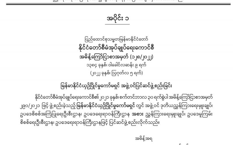 အပိုင်း (၁) တွင် နိုင်ငံတော်စီမံအုပ်ချုပ်ရေးကောင်စီ အမိန့်ကြော်ငြာစာ၊ ပြည်ထောင်စုတရားလွှတ်တော်ချုပ် အမိန့်ကြော်ငြာစာ၊ အဂတိလိုက်စားမှုတိုက်ဖျက်ရေးကော်မရှင် အမိန့်ကြော်ငြာစာ၊ ခရီးသွားလုပ်ငန်းကော်မတီ အမိန့်ကြော်ငြာစာ၊ ပြည်ထဲရေးဝန်ကြီးဌာန အမိန့်ကြော်ငြာစာ၊ ပြည်ထောင်စုအစိုးရအဖွဲ့ရုံး ဝန်ကြီးဌာန (၁) (ဝန်ကြီးရုံး) အမိန့်ကြော်ငြာစာ၊ ရင်းနှီးမြှုပ်နှံမှုနှင့် နိုင်ငံခြားစီးပွား ဆက်သွယ်ရေးဝန်ကြီး ဌာန (ပြည်ထောင်စုဝန်ကြီးရုံး) အမိန့်ကြော်ငြာစာ၊ သာသနာရေးနှင့်ယဉ်ကျေးမှုဝန်ကြီးဌာန အမိန့်ကြော် ငြာစာ၊ စိုက်ပျိုးရေး၊ မွေးမြူရေးနှင့်ဆည်မြောင်းဝန်ကြီးဌာန (ပြည်ထောင်စုဝန်ကြီးရုံး) အမိန့်ကြော်ငြာစာ၊ ပို့ဆောင်ရေးနှင့်ဆက်သွယ်ရေးဝန်ကြီးဌာန (ဝန်ကြီးရုံး) အမိန့်ကြော်ငြာစာ၊ စက်မှုဝန်ကြီးဌာန အမိန့်ကြော်ငြာစာ၊ အလုပ်သမားဝန်ကြီးဌာန အမိန့်ကြော်ငြာစာ၊ ပညာရေးဝန်ကြီးဌာန (ဝန်ကြီးရုံး) အမိန့် ကြော်ငြာစာ၊ ကျန်းမာရေးဝန်ကြီးဌာန (ဝန်ကြီးရုံး) အမိန့်ကြော်ငြာစာ၊ အားကစားနှင့် လူငယ်ရေးရာဝန်ကြီးဌာန (ဝန်ကြီးရုံး) အမိန့်ကြော်ငြာစာ၊ ဆောက်လုပ်ရေးဝန်ကြီးဌာန (ပြည်ထောင်စုဝန်ကြီးရုံး) အမိန့်ကြော်ငြာစာ၊ လူမှုဝန်ထမ်း၊ ကယ်ဆယ်ရေးနှင့် ပြန်လည်နေရာချထားရေးဝန်ကြီးဌာန (ဝန်ကြီးရုံး) အမိန့်ကြော်ငြာစာ၊ ပြည်ထောင်စုရာထူးဝန်အဖွဲ့ အမိန့်ကြော်ငြာစာ၊ ရခိုင်ပြည်နယ်ယဉ်ကျေးမှုအမွေအနှစ် များ ကာကွယ်ထိန်းသိမ်းရေးကော်မတီ အမိန့်ကြော်ငြာစာ၊