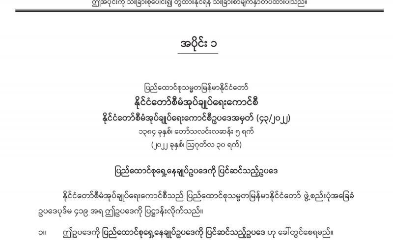 အပိုင်း (၁)တွင်နိုင်ငံတော်စီမံအုပ်ချုပ်ရေးကောင်စီ အမိန့်ကြော်ငြာစာ၊ ပြည်ထောင်စုတရားလွှတ်တော်ချုပ် အမိန့်ကြော်ငြာစာ၊ ငွေချေးသက်သေခံလက်မှတ်လုပ်ငန်းကြီးကြပ်ရေးကော်မရှင် အမိန့်ကြော်ငြာစာ၊ ပြည်ထဲရေးဝန်ကြီးဌာန(ဝန်ကြီးရုံး) အမိန့်ကြော်ငြာစာ၊ အလုပ်သမားဝန်ကြီးဌာနအမိန့်ကြော်ငြာစာ၊ ပညာရေးဝန်ကြီးဌာန(ဝန်ကြီးရုံး) အမိန့်ကြော်ငြာစာ၊