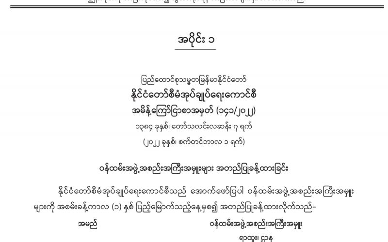အပိုင်း (၁)တွင်နိုင်ငံတော်စီမံအုပ်ချုပ်ရေးကောင်စီ အမိန့်ကြော်ငြာစာ၊ ပြည်ထောင်စုတရားလွှတ်တော်ချုပ် အမိန့်ကြော်ငြာစာ၊ နိုင်ငံခြားပညာတော်သင်စိစစ်ရွေးချယ်စေလွှတ်ရေးကော်မတီ အမိန့်ကြော်ငြာစာ၊ မြန်မာနိုင်ငံရင်းနှီးမြှုပ်နှံမှုကော်မရှင် အမိန့်ကြော်ငြာစာ၊ ပြည်ထဲရေးဝန်ကြီးဌာန (ဝန်ကြီးရုံး) အမိန့်ကြော်ငြာစာ၊ သာသနာရေးနှင့် ယဉ်ကျေးမှုဝန်ကြီးဌာန အမိန့်ကြော်ငြာစာ၊ ပို့ဆောင်ရေးနှင့်ဆက်သွယ်ရေး ဝန်ကြီးဌာန (ဝန်ကြီးရုံး) အမိန့်ကြော်ငြာစာ၊ သယံဇာတနှင့် သဘာဝပတ်ဝန်းကျင် ထိန်းသိမ်းရေးဝန်ကြီးဌာန (ပြည်ထောင်စုဝန်ကြီးရုံး) အမိန့်ကြော်ငြာစာ၊ ပညာရေးဝန်ကြီးဌာန (ဝန်ကြီးရုံး) အမိန့်ကြော်ငြာစာ၊ ကျန်းမာရေးဝန်ကြီးဌာန အမိန့်ကြော်ငြာစာ၊ ဆောက်လုပ်ရေးဝန်ကြီးဌာန အမိန့်ကြော်ငြာစာ၊ ပြည်ထောင်စုရာထူးဝန်အဖွဲ့ အမိန့်ကြော်ငြာစာ၊ မန္တလေးတိုင်းဒေသကြီးအစိုးရအဖွဲ့ရုံး အမိန့်ကြော်ငြာစာ၊ မွန်ပြည်နယ်အစိုးရအဖွဲ့ရုံး အမိန့်ကြော်ငြာစာ၊ ရန်ကုန်တိုင်းဒေသကြီးအစိုးရအဖွဲ့ရုံး အမိန့်ကြော်ငြာစာ၊ ရခိုင်ပြည်နယ်အစိုးရအဖွဲ့ရုံး အမိန့်ကြော်ငြာစာ၊ ရှမ်းပြည်နယ်အစိုးရအဖွဲ့ရုံး အမိန့်ကြော်ငြာစာ၊