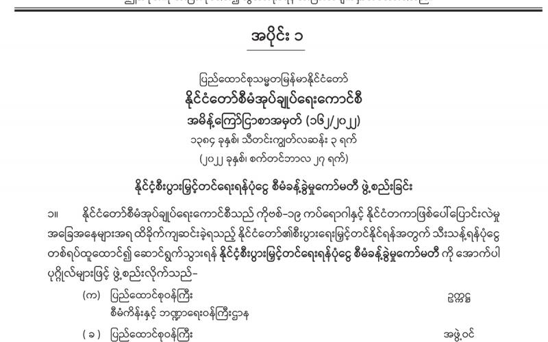 အပိုင်း (၁) တွင် နိုင်ငံတော်စီမံအုပ်ချုပ်ရေးကောင်စီ အမိန့်ကြော်ငြာစာ၊ ပြည်ထောင်စုအစိုးရအဖွဲ့ အမိန့်ကြော်ငြာစာ၊ ပြည်ထောင်စုတရားလွှတ်တော်ချုပ် အမိန့်ကြော်ငြာစာ၊ မြန်မာနိုင်ငံကွန်ပျူတာပညာ ဖွံ့ဖြိုးရေးကောင်စီ အမိန့်ကြော်ငြာစာ၊ ပြည်ထဲရေးဝန်ကြီးဌာန(ဝန်ကြီးရုံး) အမိန့်ကြော်ငြာစာ၊ နိုင်ငံခြား ရေးဝန်ကြီးဌာန အမိန့်ကြော်ငြာစာ၊ စီမံကိန်းနှင့်ဘဏ္ဍာရေးဝန်ကြီးဌာန အမိန့်ကြော်ငြာစာ၊ သာသနာရေးနှင့် ယဉ်ကျေးမှုဝန်ကြီးဌာန (ဝန်ကြီးရုံး) အမိန့်ကြော်ငြာစာ၊ စိုက်ပျိုးရေး၊ မွေးမြူရေးနှင့်ဆည်မြောင်း ဝန်ကြီးဌာန (ပြည်ထောင်စုဝန်ကြီးရုံး) အမိန့်ကြော်ငြာစာ၊ ပို့ဆောင်ရေးနှင့် ဆက်သွယ်ရေးဝန်ကြီးဌာန (ဝန်ကြီးရုံး) အမိန့်ကြော်ငြာစာ၊ လျှပ်စစ်စွမ်းအားဝန်ကြီးဌာန အမိန့်ကြော်ငြာစာ၊ အလုပ်သမားဝန်ကြီး ဌာန အမိန့်ကြော်ငြာစာ၊ ပညာရေးဝန်ကြီးဌာန (ဝန်ကြီးရုံး) အမိန့်ကြော်ငြာစာ၊ သိပ္ပံနှင့် နည်းပညာ ဝန်ကြီးဌာန (ဝန်ကြီးရုံး) အမိန့်ကြော်ငြာစာ၊ သိပ္ပံနှင့် နည်းပညာဝန်ကြီးဌာန (ဝန်ကြီးရုံး) အမိန့်ကြော်ငြာ စာ၊ ဆောက်လုပ်ရေးဝန်ကြီးဌာန (ပြည်ထောင်စုဝန်ကြီးရုံး) အမိန့်ကြော်ငြာစာ၊ တိုင်းရင်းသားလူမျိုးများ ရေးရာဝန်ကြီးဌာန (ပြည်ထောင်စုဝန်ကြီးရုံး) အမိန့်ကြော်ငြာစာ၊ ပြည်ထောင်စုစာရင်းစစ်ချုပ်ရုံး အမိန့်ကြော်ငြာစာ၊ နေပြည်တော်စည်ပင်သာယာရေးကော်မတီ အမိန့်ကြော်ငြာစာ၊ ရန်ကုန်တိုင်းဒေသကြီး အစိုးရအဖွဲ့ရန်ကုန်မြို့တော်စည်ပင်သာယာရေးကော်မတီ အမိန့်ကြော်ငြာစာ၊