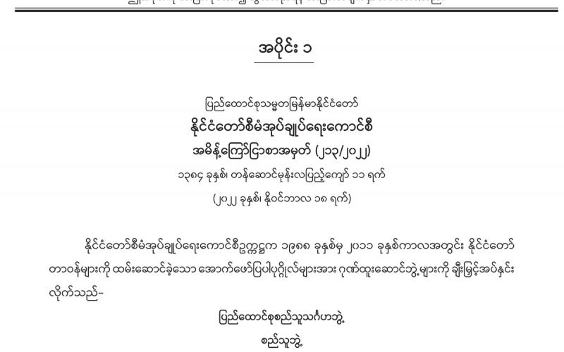 အပိုင်း (၁) တွင် နိုင်ငံတော်စီမံအုပ်ချုပ်ရေးကောင်စီ အမိန့်ကြော်ငြာစာ၊ ပြည်ထောင်စုလွှတ်တော်ရုံး အမိန့် ကြော်ငြာစာ၊ ပြည်ထောင်စုတရားလွှတ်တော်ချုပ် အမိန့်ကြော်ငြာစာ၊ ပြည်ထောင်စုရွေးကောက်ပွဲ ကော်မရှင် အမိန့်ကြော်ငြာစာ၊ မြေလွတ်၊ မြေလပ်နှင့် မြေရိုင်းများ စီမံခန့်ခွဲရေးဗဟိုကော်မတီ အမိန့် ကြော်ငြာစာ၊ လူမှုကာကွယ်စောင့်ရှောက်ရေးဆိုင်ရာ အမျိုးသားကော်မတ အမိန့်ကြော်ငြာစာ၊ ခရီးသွား လုပ်ငန်းကော်မတအမိန့်ကြော်ငြာစာ၊ ပြည်ထဲရေးဝန်ကြီးဌာန (ဝန်ကြီးရုံး) အမိန့်ကြော်ငြာစာ၊ ပြည်ထောင်စုအစိုးရအဖွဲ့ရုံးဝန်ကြီးဌာန အမိန့်ကြော်ငြာစာ၊ စီမံကိန်းနှင့် ဘဏ္ဍာရေးဝန်ကြီးဌာန အမိန့် ကြော်ငြာစာ၊ ရင်းနှီးမြှုပ်နှံမှုနှင့် နိုင်ငံခြားစီးပွားဆက်သွယ်ရေးဝန်ကြီးဌာန (ပြည်ထောင်စုဝန်ကြီးရုံး) အမိန့်ကြော်ငြာစာ၊ သာသနာရေးနှင့် ယဉ်ကျေးမှုဝန်ကြီးဌာန (ဝန်ကြီးရုံး) အမိန့်ကြော်ငြာစာ၊ စိုက်ပျိုးရေး၊ မွေးမြူရေးနှင့် ဆည်မြောင်းဝန်ကြီးဌာန (ပြည်ထောင်စုဝန်ကြီးရုံး) အမိန့်ကြော်ငြာစာ၊ ပို့ဆောင်ရေးနှင့် ဆက်သွယ်ရေးဝန်ကြီးဌာန (ဝန်ကြီးရုံး) အမိန့်ကြော်ငြာစာ၊ လျှပ်စစ်စွမ်းအားဝန်ကြီးဌာန အမိန့်ကြော်ငြာ စာ၊ ပြည်ထောင်စုရာထူးဝန်အဖ အမိန့်ကြော်ငြာစာ၊