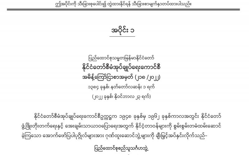 အပိုင်း (၁) တွင် နိုင်ငံတော်စီမံအုပ်ချုပ်ရေးကောင်စီ အမိန့်ကြော်ငြာစာ၊ ပြည်ထောင်စုတရားလွှတ်တော် ချုပ် အမိန့်ကြော်ငြာစာ၊ အသေးစား၊ အငယ်စားနှင့် အလတ်စားစီးပွားရေးလုပ်ငန်းများ ဖွံ့ဖြိုးတိုးတက်ရေး လုပ်ငန်းကော်မတီ အမိန့်ကြော်ငြာစာ၊ မြေလွတ်၊ မြေလပ်နှင့် မြေရိုင်းများ စီမံခန့်ခွဲရေးဗဟိုကော်မတီ အမိန့်ကြော်ငြာစာ၊ ပြည်ထဲရေးဝန်ကြီးဌာန (ဝန်ကြီးရုံး) အမိန့်ကြော်ငြာစာ၊ နယ်စပ်ရေးရာဝန်ကြီးဌာန (ဝန်ကြီးရုံး) အမိန့်ကြော်ငြာစာ၊ စီမံကိန်းနှင့်ဘဏ္ဍာရေးဝန်ကြီးဌာန (ပြည်ထောင်စုဝန်ကြီးရုံး) အမိန့်ကြော်ငြာစာ၊ အမိန့်ကြော်ငြာစာ၊ စိုက်ပျိုးရေး၊ မွေးမြူရေးနှင့် ဆည်မြောင်းဝန်ကြီးဌာန (ပြည်ထောင်စု ဝန်ကြီးရုံး) အမိန့်ကြော်ငြာစာ၊အမိန့်ကြော်ငြာစာ၊ ပို့ဆောင်ရေးနှင့် ဆက်သွယ်ရေးဝန်ကြီးဌာန (ဝန်ကြီးရုံး) အမိန့်ကြော်ငြာစာ၊ စီးပွားရေးနှင့် ကူးသန်းရောင်းဝယ်ရေးဝန်ကြီးဌာန အမိန့်ကြော်ငြာစာ၊ ပညာရေး ဝန်ကြီးဌာန (ဝန်ကြီးရုံး) အမိန့်ကြော်ငြာစာ၊ ဆောက်လုပ်ရေးဝန်ကြီးဌာန အမိန့်ကြော်ငြာစာ၊ လူမှု ဝန်ထမ်း၊ ကယ်ဆယ်ရေးနှင့် ပြန်လည်နေရာချထားရေးဝန်ကြီးဌာန (ဝန်ကြီးရုံး) အမိန့်ကြော်ငြာစာ၊