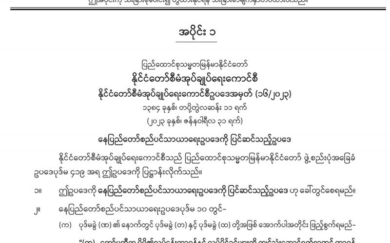 အပိုင်း (၁) တွင် နိုင်ငံတော်စီမံအုပ်ချုပ်ရေးကောင်စီ အမိန့်ကြော်ငြာစာ၊ ကာကွယ်ရေးဝန်ကြီးဌာန (ဝန်ကြီးရုံး) အမိန့်ကြော်ငြာစာ၊ ပြည်ထဲရေးဝန်ကြီးဌာန အမိန့်ကြော်ငြာစာ၊ စိုက်ပျိုးရေး၊ မွေးမြူရေးနှင့် ဆည်မြောင်းဝန်ကြီးဌာန (ပြည်ထောင်စုဝန်ကြီးရုံး) အမိန့်ကြော်ငြာစာ၊ ပို့ဆောင်ရေးနှင့် ဆက်သွယ်ရေး ဝန်ကြီးဌာန (ဝန်ကြီးရုံး) အမိန့်ကြော်ငြာစာ၊ လျှပ်စစ်စွမ်းအားဝန်ကြီးဌာန အမိန့်ကြော်ငြာစာ၊ စီးပွားရေး နှင့် ကူးသန်းရောင်းဝယ်ရေးဝန်ကြီးဌာန(ဝန်ကြီးရုံး) အမိန့်ကြော်ငြာစာ၊ ၊ လူမှုဝန်ထမ်း၊ ကယ်ဆယ်ရေးနှင့် ပြန်လည်နေရာချထားရေးဝန်ကြီးဌာန(ဝန်ကြီးရုံး) အမိန့်ကြော်ငြာစာ၊ နေပြည်တော်စည်ပင်သာယာရေး ကော်မတီ အမိန့်ကြော်ငြာစာ၊ ရန်ကုန်တိုင်းဒေသကြီးအစိုးရအဖွဲ့ ရန်ကုန်မြို့တော်စည်ပင်သာယာရေး ကော်မတီ အမိန့်ကြော်ငြာစာ၊