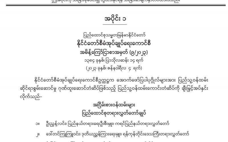 အပိုင်း (၁) တွင် နိုင်ငံတော်စီမံအုပ်ချုပ်ရေးကောင်စီ အမိန့်ကြော်ငြာစာ၊ ပြည်ထောင်စုတရားလွှတ်တော်ချုပ် အမိန့်ကြော်ငြာစာ၊ ပြည်ထောင်စုရွေးကောက်ပွဲကော်မရှင် အမိန့်ကြော်ငြာစာ၊ မြန်မာနိုင်ငံအစားအသောက်နှင့် ဆေးဝါးအာဏာပိုင်အဖွဲ့ အမိန့်ကြော်ငြာစာ၊ ပြည်ထဲရေးဝန်ကြီးဌာန အမိန့်ကြော်ငြာစာ၊ နိုင်ငံခြားရေးဝန်ကြီးဌာန အမိန့်ကြော်ငြာစာ၊ စီမံကိန်းနှင့် ဘဏ္ဍာရေးဝန်ကြီးဌာန အမိန့်ကြော်ငြာစာ၊ စိုက်ပျိုးရေး၊ မွေးမြူရေးနှင့် ဆည်မြောင်းဝန်ကြီးဌာန (ပြည်ထောင်စုဝန်ကြီးရုံး) အမိန့်ကြော်ငြာစာ၊ ပို့ဆောင်ရေးနှင့်ဆက်သွယ်ရေး ဝန်ကြီးဌာန (ဝန်ကြီးရုံး) အမိန့်ကြော်ငြာစာ၊ စီးပွားရေးနှင့် ကူးသန်း ရောင်းဝယ်ရေးဝန်ကြီးဌာန (ဝန်ကြီးရုံး) အမိန့်ကြော်ငြာစာ၊ ပညာရေးဝန်ကြီးဌာန (ဝန်ကြီးရုံး) အမိန့် ကြော်ငြာစာ၊ မြန်မာနိုင်ငံတော်ဗဟိုဘဏ် အမိန့်ကြော်ငြာစာ၊