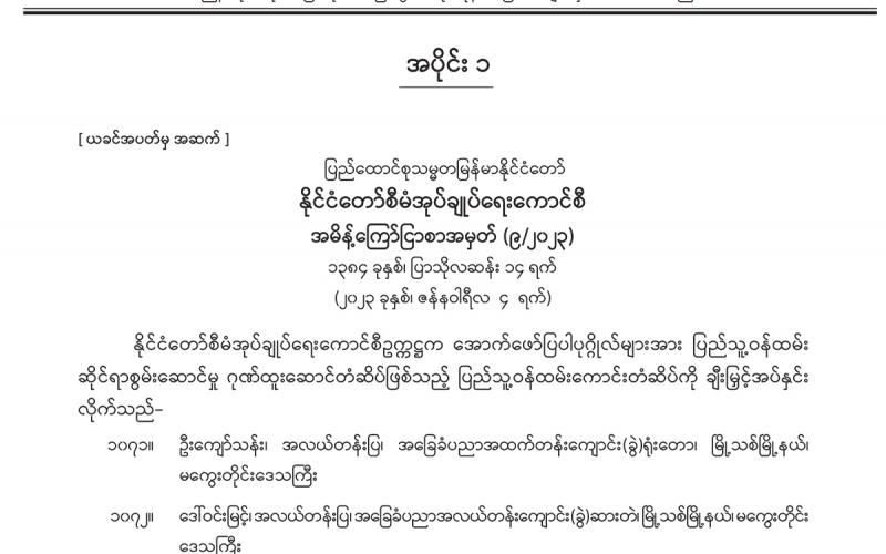 အပိုင်း (၁) တွင် နိုင်ငံတော်စီမံအုပ်ချုပ်ရေးကောင်စီ အမိန့်ကြော်ငြာစာ၊ မသန်စွမ်းသူများ၏ အခွင့်အရေး များဆိုင်ရာ အမျိုးသားကော်မတီ အမိန့်ကြော်ငြာစာ၊ စီမံကိန်းနှင့် ဘဏ္ဍာရေးဝန်ကြီးဌာန (ပြည်ထောင်စု ဝန်ကြီးရုံး) အမိန့်ကြော်ငြာစာ၊ သာသနာရေးနှင့် ယဉ်ကျေးမှုဝန်ကြီးဌာန (ဝန်ကြီးရုံး) အမိန့်ကြော်ငြာစာ၊ မြန်မာနိုင်ငံတော်ဗဟိုဘဏ် အမိန့်ကြော်ငြာစာ၊