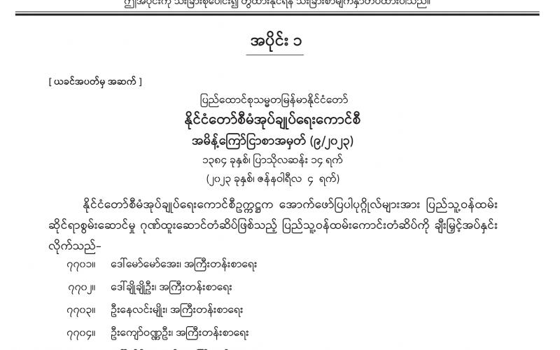 အပိုင်း (၁) တွင် နိုင်ငံတော်စီမံအုပ်ချုပ်ရေးကောင်စီ အမိန့်ကြော်ငြာစာ၊ ပြည်ထောင်စု တရားလွှတ်တော် ချုပ် အမိန့်ကြော်ငြာစာ၊ ပုဂ္ဂလိကပိုင်ပြုလုပ်ရေးကော်မရှင် အမိန့်ကြော်ငြာစာ၊ မသန်စွမ်းသူများ၏ အခွင့်အရေးများဆိုင်ရာ အမျိုးသားကော်မတီ အမိန့်ကြော်ငြာစာ၊ ပြည်ထဲရေးဝန်ကြီးဌာန (ဝန်ကြီးရုံး) အမိန့်ကြော်ငြာစာ၊ ပြန်ကြားရေးဝန်ကြီးဌာန အမိန့်ကြော်ငြာစာ၊ သာသနာရေးနှင့် ယဉ်ကျေးမှု ဝန်ကြီးဌာန အမိန့်ကြော်ငြာစာ၊ စိုက်ပျိုးရေး၊ မွေးမြူရေးနှင့် ဆည်မြောင်းဝန်ကြီးဌာန (ပြည်ထောင်စုဝန်ကြီးရုံး) အမိန့်ကြော်ငြာစာ၊ ပို့ဆောင်ရေးနှင့် ဆက်သွယ်ရေးဝန်ကြီးဌာန (ဝန်ကြီးရုံး) အမိန့်ကြော်ငြာစာ၊ ပညာရေးဝန်ကြီးဌာန (ဝန်ကြီးရုံး) အမိန့်ကြော်ငြာစာ၊ သိပ္ပံနှင့် နည်းပညာ ဝန်ကြီးဌာန (ဝန်ကြီးရုံး) အမိန့်ကြော်ငြာစာ၊ အားကစားနှင့် လူငယ်ရေးရာဝန်ကြီးဌာန (ဝန်ကြီးရုံး) အမိန့်ကြော်ငြာစာ၊ ဆောက်လုပ်ရေးဝန်ကြီးဌာန အမိန့်ကြော်ငြာစာ၊ ဟိုတယ်နှင့် ခရီးသွားလာရေး ဝန်ကြီးဌာန (ဝန်ကြီးရုံး) အမိန့်ကြော်ငြာစာတို့ ပါဝင်ပါသည်။