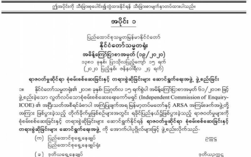 အပိုင်း (၁) တွင် နိုင်ငံတော်သမ္မတရုံး အမိန့်ကြော်ငြာစာ၊ ပြည်ထောင်စုလွှတ်တော်ရုံး အမိန့်ကြော်ငြာစာ၊ ပြည်ထောင်စုတရားလွှတ်တော်ချုပ် အမိန့်ကြော်ငြာစာ၊ ပြည်ထောင်စု ရွေးကောက်ပွဲကော်မရှင် ကြေညာချက်၊ ပြည်ထောင်စုအစိုးရအဖွဲ့ရုံး ဝန်ကြီးဌာန အမိန့်ကြော်ငြာစာ၊ စိုက်ပျိုးရေး၊ မွေးမြူရေးနှင့် ဆည်မြောင်းဝန်ကြီးဌာန (ဝန်ကြီးရုံး) အမိန့်ကြော်ငြာစာ၊ ပို့ဆောင်ရေးနှင့် ဆက်သွယ်ရေးဝန်ကြီးဌာန အမိန့်ကြော်ငြာစာ၊ သယံဇာတနှင့် သဘာဝပတ်ဝန်းကျင် ထိန်းသိမ်းရေးဝန်ကြီးဌာန (ပြည်ထောင်စုဝန်ကြီးရုံး) အမိန့်ကြော်ငြာစာ၊ အလုပ်သမား၊ လူဝင်မှုကြီးကြပ်ရေးနှင့် ပြည်သူ့အင်အားဝန်ကြီးဌာန (ဝန်ကြီးရုံး) အမိန့်ကြော်ငြာစာ၊ စီးပွားရေးနှင့် ကူးသန်းရောင်းဝယ်ရေးဝန်ကြီးဌာန (ဝန်ကြီးရုံး) အမိန့်ကြော်ငြာစာ၊ ကျန်းမာရေးနှင့် အားကစား ဝန်ကြီးဌာန အမိန့်ကြော်ငြာစာ၊ ဆောက်လုပ်ရေးဝန်ကြီးဌာန (ဝန်ကြီးရုံး) အမိန့်ကြော်ငြာစာ၊ လူမှုဝန်ထမ်း၊ ကယ်ဆယ်ရေးနှင့် ပြန်လည်နေရာချထားရေးဝန်ကြီးဌာန (ဝန်ကြီးရုံး) အမိန့်ကြော်ငြာစာ၊