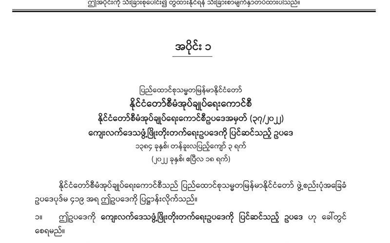 အပိုင်း (၁) တွင်  နိုင်ငံတော်စီမံအုပ်ချုပ်ရေးကောင်စီ အမိန့်ကြော်ငြာစာ၊ ပြည်ထောင်စုအစိုးရအဖွဲ့ အမိန့်ကြော်ငြာစာ၊ ပြည်ထောင်စုတရားလွှတ်တော်ချုပ် အမိန့်ကြော်ငြာစာ၊ ပြည်ထောင်စုရွေးကောက်ပွဲကော်မရှင် အမိန့်ကြော်ငြာစာ၊ ပြည်ထဲရေးဝန်ကြီးဌာန (ဝန်ကြီးရုံး) အမိန့်ကြော်ငြာစာ၊ စီမံကိန်းနှင့် ဘဏ္ဍာရေးဝန်ကြီးဌာန အမိန့်ကြော်ငြာစာ၊ ရင်းနှီးမြှုပ်နှံမှုနှင့် နိုင်ငံခြားစီးပွားဆက်သွယ်ရေးဝန်ကြီးဌာန (ပြည်ထောင်စုဝန်ကြီးရုံး) အမိန့်ကြော်ငြာစာ၊ တင်ဒါကော်မတီ အမိန့်ကြော်ငြာစာ၊ သာသနာရေးနှင့် ယဉ်ကျေးမှုဝန်ကြီးဌာန အမိန့်ကြော်ငြာစာ၊ အမျိုးသားအဆင့် ယဉ်ကျေးမှုအမွေအနှစ်ဒေသများ ကာကွယ်ထိန်းသိမ်းရေးကော်မတီ အမိန့်ကြော်ငြာစာ၊ စိုက်ပျိုးရေး၊ မွေးမြူရေးနှင့် ဆည်မြောင်းဝန်ကြီး ဌာန (ပြည်ထောင်စုဝန်ကြီးရုံး) အမိန့်ကြော်ငြာစာ၊ ပို့ဆောင်ရေးနှင့် ဆက်သွယ်ရေးဝန်ကြီးဌာန (ဝန်ကြီးရုံး) အမိန့်ကြော်ငြာစာ၊ အလုပ်သမားဝန်ကြီးဌာန (ဝန်ကြီးရုံး) အမိန့်ကြော်ငြာစာ၊ စီးပွားရေးနှင့် ကူးသန်းရောင်းဝယ်ရေးဝန်ကြီးဌာန အမိန့်အမှတ်၊ ပညာရေးဝန်ကြီးဌာန (ဝန်ကြီးရုံး) အမိန့်ကြော်ငြာစာ၊ အားကစားနှင့် လူငယ်ရေးရာဝန်ကြီးဌာန (ဝန်ကြီးရုံး) အမိန့်ကြော်ငြာစာ၊ ဆောက်လုပ်ရေးဝန်ကြီးဌာန အမိန့်ကြော်ငြာစာ၊ လူမှုဝန်ထမ်း၊ ကယ်ဆယ်ရေးနှင့် ပြန်လည်နေရာချထားရေးဝန်ကြီးဌာန (ဝန်ကြီးရုံး) အမိန့်ကြော်ငြာစာ၊ မြန်မာနိုင်ငံတော်ဗဟိုဘဏ် အမိန့်ကြော်ငြာစာ၊