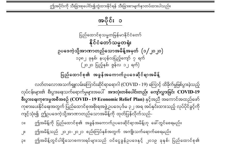 အပိုင်း (၁) တွင် နိုင်ငံတော်သမ္မတရုံး အမိန့်ကြော်ငြာစာ၊ ပြည်ထောင်စုအစိုးရအဖွဲ့ အမိန့်ကြော်ငြာ စာ၊ ပြည်ထောင်စု ရွေးကောက်ပွဲကော်မရှင် ကြေညာချက်၊ ပြည်ထဲရေးဝန်ကြီးဌာန (ဝန်ကြီးရုံး) အမိန့်ကြော်ငြာစာ၊ သာသာနာရေးနှင့် ယဉ်ကျေးမှုဝန်ကြီးဌာန အမိန့်ကြော်ငြာစာ၊ သယံဇာတနှင့် သဘာဝပတ်ဝန်းကျင် ထိန်းသိမ်းရေးဝန်ကြီးဌာန ပြည်ထောင်စုဝန်ကြီးရုံး အမိန့်ကြော်ငြာစာ၊ စီးပွားရေးနှင့်ကူးသန်းရောင်းဝယ်ရေး ဝန်ကြီးဌာန (ဝန်ကြီးရုံး) အမိန့်ကြော်ငြာစာ၊ ပြည်ထောင်စု စာရင်းစစ်ချုပ်ရုံး အမိန့်ကြော်ငြာစာ၊ ရန်ကုန်တိုင်း ဒေသကြီးအစိုးရ ရန်ကုန်မြို့တော် စည်ပင်သာယာရေးကော်မတီ အမိန့်ကြော်ငြာစာ၊