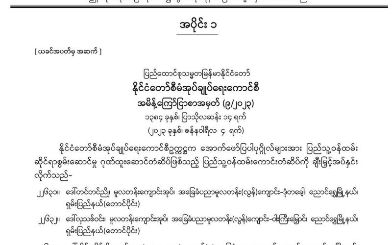 အပိုင်း (၁) တွင် နိုင်ငံတော်စီမံအုပ်ချုပ်ရေးကောင်စီ အမိန့်ကြော်ငြာစာ၊ ပြည်ထောင်စုတရား လွှတ်တော်ချုပ် အမိန့်ကြော်ငြာစာ၊ အမျိုးသားသဘာဝဘေးအန္တရာယ်ဆိုင်ရာစီမံခန့်ခွဲမှုကော်မတီ အမိန့်ကြော်ငြာစာ၊ ပို့ဆောင်ရေးနှင့် ဆက်သွယ်ရေးဝန်ကြီးဌာန (ဝန်ကြီးရုံး) အမိန့်ကြော်ငြာစာ၊ နိုင်ငံခြားရေးဝန်ကြီးဌာန အမိန့်ကြော်ငြာစာ၊ ပြည်ထဲရေးဝန်ကြီးဌာန အမိန့်ကြော်ငြာစာ၊ ပြည်ထောင်စုအစိုးရအဖွဲ့ရုံးဝန်ကြီးဌာန(၁) (ဝန်ကြီးရုံး) အမိန့်ကြော်ငြာစာ၊ နယ်စပ်ရေးရာ ဝန်ကြီးဌာန အမိန့်ကြော်ငြာစာ၊ ပြန်ကြားရေးဝန်ကြီးဌာန (ဝန်ကြီးရုံး) အမိန့်ကြော်ငြာစာ၊ သာသနာရေးနှင့် ယဉ်ကျေးမှုဝန်ကြီးဌာန အမိန့်ကြော်ငြာစာ၊ စိုက်ပျိုးရေး၊ မွေးမြူရေးနှင့် ဆည်မြောင်းဝန်ကြီးဌာန (ပြည်ထောင်စုဝန်ကြီးရုံး) အမိန့်ကြော်ငြာစာ၊ အလုပ်သမားဝန်ကြီးဌာန အမိန့်ကြော်ငြာစာ၊ ကျန်းမာရေးဝန်ကြီးဌာန အမိန့်ကြော်ငြာစာ၊ ဆောက်လုပ်ရေးဝန်ကြီးဌာန အမိန့်ကြော်ငြာစာ၊ မြန်မာနိုင်ငံတော်ဗဟိုဘဏ် အမိန့်ကြော်ငြာစာတို့ ပါဝင်ပါသည်။