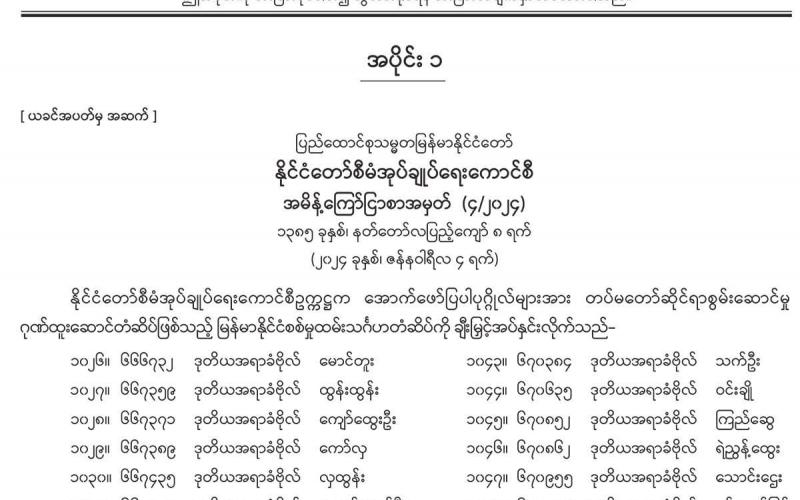 အမိန့်ကြော်ငြာစာ၊ ပြည်ထောင်စုတရားလွှတ်တော်ချုပ် အမိန့်ကြော်ငြာစာ၊  ပြည်ထောင်စု ရွေးကောက်ပွဲကော်မရှင် ကြေညာချက်၊ ခရီးသွားလုပ်ငန်းကော်မတီ အမိန့်ကြော်ငြာစာ၊ အမျိုးသား သဘာဝဘေးအန္တရာယ်ဆိုင်ရာစီမံခန့်ခွဲမှုကော်မတီ အမိန့်ကြော်ငြာစာ၊ မူးယစ်ဆေးဝါးနှင့် စိတ်ကို ပြောင်းလဲစေသော ဆေးဝါးများအန္တရာယ် တားဆီးကာကွယ်ရေးဗဟိုအဖွဲ့ အမိန့်ကြော်ငြာစာ၊ ပို့ဆောင်ရေးနှင့် ဆက်သွယ်ရေးဝန်ကြီးဌာန (ဝန်ကြီးရုံး) အမိန့်ကြော်ငြာစာ၊ စီမံကိန်းနှင့် ဘဏ္ဍာရေးဝန်ကြီးဌာန (ပြည်ထောင်စုဝန်ကြီးရုံး) အမိန့်ကြော်ငြာစာ၊ ပြည်ထဲရေးဝန်ကြီးဌာန အမိန့်ကြော်ငြာစာ၊ ရင်းနှီးမြှုပ်နှံမှုနှင့် နိုင်ငံခြားစီးပွားဆက်သွယ်ရေးဝန်ကြီးဌာန အမိန့် ကြော်ငြာစာ၊ သယံဇာတနှင့် သဘာဝပတ်ဝန်းကျင်ထိန်းသိမ်းရေးဝန်ကြီးဌာန (ပြည်ထောင်စု ဝန်ကြီးရုံး) အမိန့်ကြော်ငြာစာ၊ လူမှုဝန်ထမ်း၊ ကယ်ဆယ်ရေးနှင့် ပြန်လည်နေရာချထားရေး ဝန်ကြီးဌာန (ဝန်ကြီးရုံး) အမိန့်ကြော်ငြာစာတို့ ပါဝင်ပါသည်။