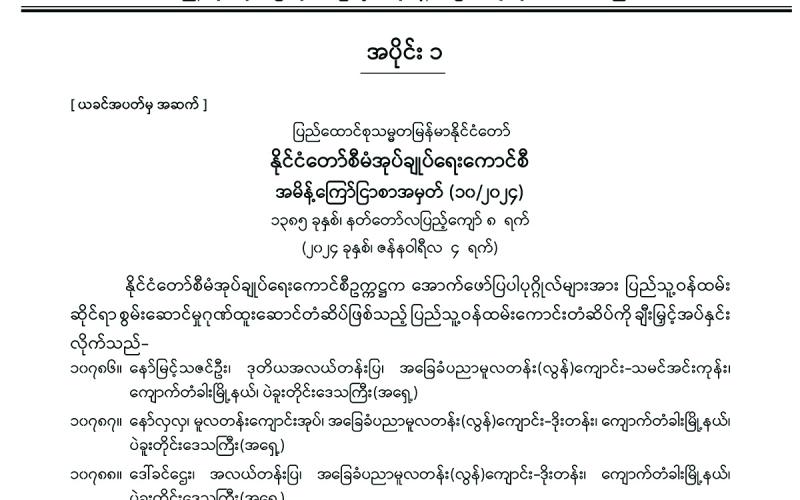 အပိုင်း (၁) တွင် နိုင်ငံတော်စီမံအုပ်ချုပ်ရေးကောင်စီ အမိန့်ကြော်ငြာစာ၊ ပြည်ထောင်စုတရား လွှတ်တော်ချုပ် အမိန့်ကြော်ငြာစာ၊ မြန်မာနိုင်ငံရင်းနှီးမြှုပ်နှံမှုကော်မရှင် အမိန့်ကြော်ငြာစာ၊ ခရီးသွားလုပ်ငန်းကော်မတီ အမိန့်ကြော်ငြာစာ၊ မြေလွတ်၊ မြေလပ်နှင့် မြေရိုင်းများ စီမံခန့်ခွဲရေး ဗဟိုကော်မတီ အမိန့်ကြော်ငြာစာ၊ ပို့ဆောင်ရေးနှင့် ဆက်သွယ်ရေးဝန်ကြီးဌာန (ဝန်ကြီးရုံး) အမိန့်ကြော်ငြာစာ၊ ပြည်ထဲရေးဝန်ကြီးဌာန အမိန့်ကြော်ငြာစာ၊ စီမံကိန်းနှင့် ဘဏ္ဍာရေးဝန်ကြီးဌာန အမိန့်ကြော်ငြာစာ၊ နိုင်ငံခြားရေးဝန်ကြီးဌာန အမိန့်ကြော်ငြာစာ၊ နိုင်ငံတော်စီမံအုပ်ချုပ်ရေး ကောင်စီဥက္ကဋ္ဌရုံးဝန်ကြီးဌာန (၂) အမိန့်ကြော်ငြာစာ၊ နယ်စပ်ရေးရာဝန်ကြီးဌာန (ဝန်ကြီးရုံး) အမိန့်ကြော်ငြာစာ၊ သာသနာရေးနှင့်ယဉ်ကျေးမှုဝန်ကြီးဌာနအမိန့်ကြော်ငြာစာ၊ စိုက်ပျိုးရေး၊ မွေးမြူရေးနှင့် ဆည်မြောင်းဝန်ကြီးဌာန (ပြည်ထောင်စုဝန်ကြီးရုံး) အမိန့်ကြော်ငြာစာ၊ စီးပွားရေးနှင့် ကူးသန်းရောင်းဝယ်ရေးဝန်ကြီးဌာန (ပြည်ထောင်စုဝန်ကြီးရုံး) အမိန့်ကြော်ငြာစာ၊ ပညာရေး ဝန်ကြီးဌာန (ဝန်ကြီးရုံး) အမိန့်ကြော်ငြာစာ၊ ကျန်းမာရေးဝန်ကြီးဌာန အမိန့်ကြော်ငြာစာ၊ ဆောက်လုပ်ရေးဝန်ကြီးဌာန အမိန့်ကြော်ငြာစာ၊ ဟိုတယ်နှင့် ခရီးသွားလာရေးဝန်ကြီးဌာန (ဝန်ကြီးရုံး) အမိန့်ကြော်ငြာစာ၊ တိုင်းရင်းသားလူမျိုးများရေးရာဝန်ကြီးဌာန (ပြည်ထောင်စု ဝန်ကြီးရုံး) အမိန့်ကြော်ငြာစာ၊ ရန်ကုန်တိုင်းဒေသကြီးအစိုးရအဖွဲ့ ရန်ကုန်မြို့တော်စည်ပင် သာယာရေးကော်မတီ အမိန့်ကြော်ငြာစာတို့ ပါဝင်ပါသည်။