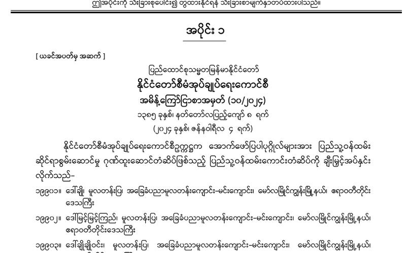 အပိုင်း (၁) တွင် နိုင်ငံတော်စီမံအုပ်ချုပ်ရေးကောင်စီ အမိန့်ကြော်ငြာစာ၊ ပြည်ထောင်စုအစိုးရအဖွဲ့ အမိန့်ကြော်ငြာစာ၊ (၂၅) ကြိမ်မြောက် ငွေရတုအထိမ်းအမှတ် မြန်မာ့ရိုးရာယဉ်ကျေးမှု အဆို၊ အက၊ အရေး၊ အတီး ပြိုင်ပွဲကျင်းပရေးလုပ်ငန်းကော်မတီ အမိန့်ကြော်ငြာစာ၊ အနည်းဆုံးအခ ကြေးငွေသတ်မှတ်ရေးဆိုင်ရာ အမျိုးသားကော်မတီ အမိန့်ကြော်ငြာစာ၊ ပို့ဆောင်ရေးနှင့် ဆက်သွယ်ရေးဝန်ကြီးဌာန (ဝန်ကြီးရုံး) အမိန့်ကြော်ငြာစာ၊ ပြည်ထဲရေးဝန်ကြီးဌာန အမိန့် ကြော်ငြာစာ၊ စီမံကိန်းနှင့် ဘဏ္ဍာရေးဝန်ကြီးဌာန အမိန့်ကြော်ငြာစာ၊ ရင်းနှီးမြှုပ်နှံမှုနှင့် နိုင်ငံခြား စီးပွားဆက်သွယ်ရေးဝန်ကြီးဌာန အမိန့်ကြော်ငြာစာ၊ စိုက်ပျိုးရေး၊ မွေးမြူရေးနှင့် ဆည်မြောင်း ဝန်ကြီးဌာန (ပြည်ထောင်စုဝန်ကြီးရုံး) အမိန့်ကြော်ငြာစာ၊ သယံဇာတနှင့် သဘာဝပတ်ဝန်းကျင် ထိန်းသိမ်းရေးဝန်ကြီးဌာန အမိန့်ကြော်ငြာစာ၊ စက်မှုဝန်ကြီးဌာန အမိန့်ကြော်ငြာစာ၊ လူဝင်မှု ကြီးကြပ်ရေးနှင့် ပြည်သူ့အင်အားဝန်ကြီးဌာန (ဝန်ကြီးရုံး) အမိန့်ကြော်ငြာစာ၊ စီးပွားရေးနှင့် ကူးသန်းရောင်းဝယ်ရေးဝန်ကြီးဌာန အမိန့်ကြော်ငြာစာ၊ ပညာရေးဝန်ကြီးဌာန (ဝန်ကြီးရုံး) အမိန့် ကြော်ငြာစာ၊ သိပ္ပံနှင့် နည်းပညာဝန်ကြီးဌာန (ဝန်ကြီးရုံး) အမိန့်ကြော်ငြာစာ၊ ဆောက်လုပ်ရေး ဝန်ကြီးဌာန အမိန့်ကြော်ငြာစာ၊ ဟိုတယ်နှင့် ခရီးသွားလာရေးဝန်ကြီးဌာန (ဝန်ကြီးရုံး) အမိန့် ကြော်ငြာစာ၊ တိုင်းရင်းသားလူမျိုးများရေးရာဝန်ကြီးဌာန အမိန့်ကြော်ငြာစာ၊ ပြည်ထောင်စု ရာထူးဝန်အဖွဲ့ အမိန့်ကြော်ငြာစာ၊ မြန်မာနိုင်ငံတော်ဗဟိုဘဏ် အမိန့်ကြော်ငြာစာတို့ ပါဝင်ပါသည်။