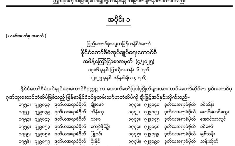 အပိုင်း (၁) တွင် နိုင်ငံတော်စီမံအုပ်ချုပ်ရေးကောင်စီ အမိန့်ကြော်ငြာစာ၊ ပြည်ထောင်စု တရားလွှတ်တော်ချုပ် အမိန့်ကြော်ငြာစာ၊ အမျိုးသားအဆင့် ယဉ်ကျေးမှုအမွေအနှစ်ဒေသများ ကာကွယ်ထိန်းသိမ်းရေးကော်မတီ အမိန့်ကြော်ငြာစာ၊ အမျိုးသားစံချိန်စံညွှန်းကောင်စီ အမိန့် ကြော်ငြာစာ၊ ပို့ဆောင်ရေးနှင့် ဆက်သွယ်ရေးဝန်ကြီးဌာန (ဝန်ကြီးရုံး) အမိန့်ကြော်ငြာစာ၊ ပြည်ထဲရေးဝန်ကြီးဌာန အမိန့်ကြော်ငြာစာ၊ စီမံကိန်းနှင့် ဘဏ္ဍာရေးဝန်ကြီးဌာန အမိန့် ကြော်ငြာစာ၊ နိုင်ငံခြားရေးဝန်ကြီးဌာန အမိန့်ကြော်ငြာစာ၊ နယ်စပ်ရေးရာဝန်ကြီးဌာန (ဝန်ကြီးရုံး) အမိန့်ကြော်ငြာစာ၊ ရင်းနှီးမြှုပ်နှံမှုနှင့် နိုင်ငံခြားစီးပွားဆက်သွယ်ရေးဝန်ကြီးဌာန အမိန့် ကြော်ငြာစာ၊ ပြန်ကြားရေးဝန်ကြီးဌာန (ဝန်ကြီးရုံး) အမိန့်ကြော်ငြာစာ၊ စိုက်ပျိုးရေး၊ မွေးမြူ ရေးနှင့် ဆည်မြောင်းဝန်ကြီးဌာန (ပြည်ထောင်စုဝန်ကြီးရုံး) အမိန့်ကြော်ငြာစာ၊ စက်မှုဝန်ကြီးဌာန အမိန့်ကြော်ငြာစာ၊ စီးပွားရေးနှင့် ကူးသန်းရောင်းဝယ်ရေးဝန်ကြီးဌာန (ပြည်ထောင်စုဝန်ကြီးရုံး) အမိန့်ကြော်ငြာစာ၊ ပညာရေးဝန်ကြီးဌာန (ဝန်ကြီးရုံး) အမိန့်ကြော်ငြာစာ၊ ဆောက်လုပ်ရေး ဝန်ကြီးဌာန အမိန့်ကြော်ငြာစာ၊ ရန်ကုန်တိုင်းဒေသကြီးအစိုးရအဖွဲ့ ရန်ကုန်မြို့တော်စည်ပင် သာယာရေးကော်မတီ အမိန့်ကြော်ငြာစာတို့ ပါဝင်ပါသည်။