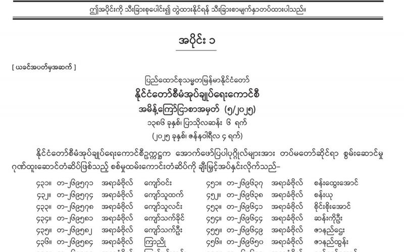အပိုင်း (၁) တွင် နိုင်ငံတော်စီမံအုပ်ချုပ်ရေးကောင်စီ အမိန့်ကြော်ငြာစာ၊ ပြည်ထောင်စု တရားလွှတ်တော်ချုပ် အမိန့်ကြော်ငြာစာ၊ ပြည်ထဲရေးဝန်ကြီးဌာန (ဝန်ကြီးရုံး) အမိန့် ကြော်ငြာစာ၊ စီမံကိန်းနှင့် ဘဏ္ဍာရေးဝန်ကြီးဌာန အမိန့်ကြော်ငြာစာ၊ နိုင်ငံတော်စီမံ အုပ်ချုပ်ရေးကောင်စီဥက္ကဋ္ဌရုံးဝန်ကြီးဌာန(၃) အမိန့်ကြော်ငြာစာ၊ ရင်းနှီးမြှုပ်နှံမှုနှင့် နိုင်ငံခြားစီးပွားဆက်သွယ်ရေးဝန်ကြီးဌာန တင်ဒါကော်မတီ အမိန့်ကြော်ငြာစာ၊ ပြန်ကြားရေးဝန်ကြီးဌာန အမိန့်ကြော်ငြာစာ၊ လျှပ်စစ်စွမ်းအားဝန်ကြီးဌာန အမိန့် ကြော်ငြာစာ၊ အလုပ်သမားဝန်ကြီးဌာန အမိန့်ကြော်ငြာစာ၊ စီးပွားရေးနှင့် ကူးသန်း ရောင်းဝယ်ရေးဝန်ကြီးဌာန (ပြည်ထောင်စုဝန်ကြီးရုံး) အမိန့်ကြော်ငြာစာ၊ အားကစားနှင့် လူငယ်ရေးရာဝန်ကြီးဌာန (ဝန်ကြီးရုံး) အမိန့်ကြော်ငြာစာ၊ ဆောက်လုပ်ရေးဝန်ကြီးဌာန အမိန့်ကြော်ငြာစာ၊ ဟိုတယ်နှင့် ခရီးသွားလာရေးဝန်ကြီးဌာန (ဝန်ကြီးရုံး) အမိန့် ကြော်ငြာစာ၊ တိုင်းရင်းသားလူမျိုးများရေးရာဝန်ကြီးဌာန (ပြည်ထောင်စုဝန်ကြီးရုံး) အမိန့် ကြော်ငြာစာတို့ ပါဝင်ပါသည်။