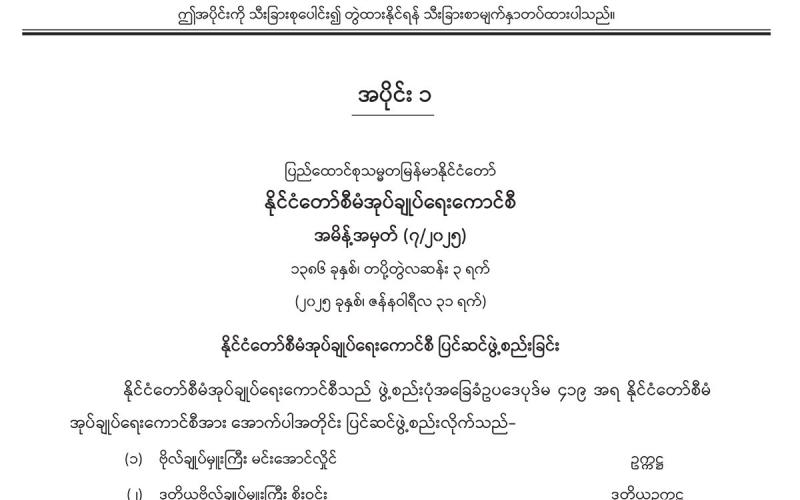အပိုင်း (၁) တွင် နိုင်ငံတော်စီမံအုပ်ချုပ်ရေးကောင်စီ အမိန့်ကြော်ငြာစာ၊ ပြည်ထောင်စု အစိုးရအဖွဲ့ အမိန့်ကြော်ငြာစာ၊ ပြည်ထောင်စုတရားလွှတ်တော်ချုပ် အမိန့်ကြော်ငြာစာ၊ အမျိုးသားသဘာဝဘေးအန္တရာယ်ဆိုင်ရာ စီမံခန့်ခွဲမှုကော်မတီ အမိန့်ကြော်ငြာစာ၊ ပို့ဆောင်နှင့် ဆက်သွယ်ရေးဝန်ကြီးဌာန (ဝန်ကြီးရုံး) အမိန့်ကြော်ငြာစာတို့ ပါဝင်ပါသည်။