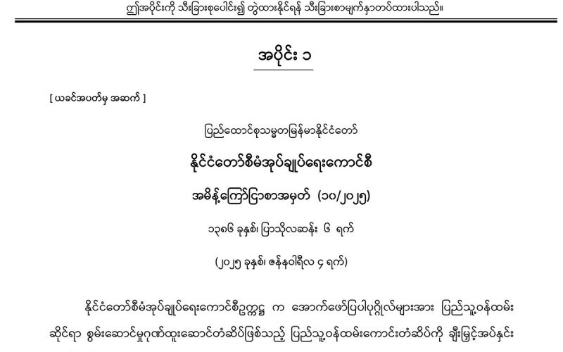 အပိုင်း (၁) တွင် နိုင်ငံတော်စီမံအုပ်ချုပ်ရေးကောင်စီ အမိန့်ကြော်ငြာစာ၊ ပြည်ထောင်စု တရားလွှတ်တော်ချုပ် အမိန့်ကြော်ငြာစာ၊ ပြည်ထောင်စုရွေးကောက်ပွဲကော်မရှင် အမိန့် ကြော်ငြာစာ၊ လူမှုကာကွယ်စောင့်ရှောက်ရေးဆိုင်ရာ အမျိုးသားကော်မတီ အမိန့်ကြော်ငြာ စာ၊ ပို့ဆောင်ရေးနှင့် ဆက်သွယ်ရေးဝန်ကြီးဌာန (ဝန်ကြီးရုံး) အမိန့်ကြော်ငြာစာ၊ ပြည်ထဲရေးဝန်ကြီးဌာန (ဝန်ကြီးရုံး) အမိန့်ကြော်ငြာစာ၊ စီမံကိန်းနှင့် ဘဏ္ဍာရေးဝန်ကြီးဌာန အမိန့်ကြော်ငြာစာ၊ ပြန်ကြားရေးဝန်ကြီးဌာန အမိန့်ကြော်ငြာစာ၊ သာသနာရေးနှင့် ယဉ်ကျေးမှုဝန်ကြီးဌာန (ဝန်ကြီးရုံး) အမိန့်ကြော်ငြာစာ၊ သယံဇာတနှင့် သဘာဝ ပတ်ဝန်းကျင်ထိန်းသိမ်းရေးဝန်ကြီးဌာန အမိန့်ကြော်ငြာစာ၊ လျှပ်စစ်စွမ်းအားဝန်ကြီးဌာန အမိန့်ကြော်ငြာစာ၊ စက်မှုဝန်ကြီးဌာန အမိန့်ကြော်ငြာစာ၊ အလုပ်သမားဝန်ကြီးဌာန အမိန့်ကြော်ငြာစာ၊ စီးပွားရေးနှင့် ကူးသန်းရောင်းဝယ်ရေးဝန်ကြီးဌာန (ပြည်ထောင်စု ဝန်ကြီးရုံး) အမိန့်ကြော်ငြာစာ၊ ပညာရေးဝန်ကြီးဌာန (ဝန်ကြီးရုံး) အမိန့်ကြော်ငြာစာ၊ ကျန်းမာရေးဝန်ကြီးဌာန အမိန့်ကြော်ငြာစာ၊ မြန်မာနိုင်ငံတော်ဗဟိုဘဏ် အမိန့်ကြော်ငြာစာ တို့ ပါဝင်ပါသည်။