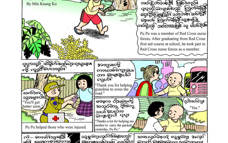သုတဆောင်းပါးကဏ္ဍတွင် ခန္ဓာကိုယ်အတွက် အရေးကြီးသည့် ရေသောက်ခြင်းနှင့် ရေသောက် ခြင်းကြောင့် ရရှိမည့် ကျန်းမာရေးကောင်းကျိုးများကို ရေးသားထားသည့် သုတဆောင်းပါးကဏ္ဍ၊ ကလေး တို့အနေနှင့် do နှင့် play အသုံးအနှုန်းကို ရွေးချယ်အသုံးပြုနိုင်မည့် “ဉာဏ်စမ်း” ကဏ္ဍ၊ ဉာဏ်များသည့် လှေသူကြီး၏ ကတိစကားအတိုင်း လှေနှင့် ကုန်ပစ္စည်းများရသွားသည့် မောင်ဒေါနတို့အကြောင်း ရေးသား ထားသည့် “မိခင်အတွက် စွန့်စားသူ” ပုံပြင်ကဏ္ဍ၊ မောင်အောင်မြတ်သူ သိချင်သော လောကနတ်ရုပ်တု အကြောင်းကို ဦးမြလွင်မှ ရှင်းလင်းပြောပြ ထားသည်ကို ရေးသားထားသည့် “ငြိမ်းချမ်းရေး ပန်း” ဝတ္ထု ကဏ္ဍ၊ ကလေးတို့အနေနှင့် ပျင်းသည့်စိတ်ကို ဖယ်ကာ အချိန်ကို တိကျစွာ အသုံးပြုနိုင်ကြောင်း၊ အချိန် မဖြုန်းသင့်ကြောင်းနှင့် ရည်မှန်းချက်ရောက်အောင် ကြိုးစားသင့်ကြောင်း ရေးဖွဲ့ထားသည့် “ပျင်းသူမချွန်၊ ချွန်သူ မပျင်း” ကဗျာကဏ္ဍတို့ကို တင်ဆက်ထားပါသည်။
