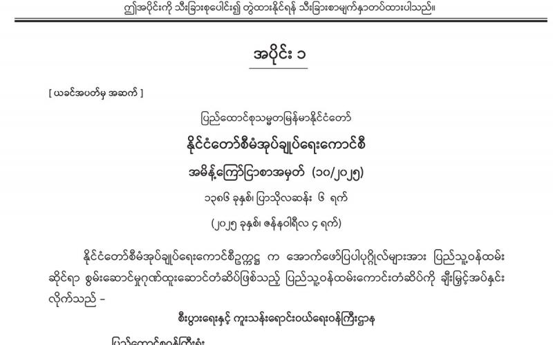 အပိုင်း (၁) တွင် နိုင်ငံတော်စီမံအုပ်ချုပ်ရေးကောင်စီ အမိန့်ကြော်ငြာစာ၊ ပြည်ထောင်စု တရားလွှတ်တော်ချုပ် အမိန့်ကြော်ငြာစာ၊ အဂတိလိုက်စားမှုတိုက်ဖျက်ရေးကော်မရှင် အမိန့် ကြော်ငြာစာ၊ မြန်မာနိုင်ငံစားသုံးသူကာကွယ်ရေးကော်မရှင် အမိန့်ကြော်ငြာစာ၊ မြေလွတ်၊ မြေလပ်နှင့် မြေရိုင်းများစီမံခန့်ခွဲရေးဗဟိုကော်မတီ အမိန့်ကြော်ငြာစာ၊ ပြည်ထဲရေး ဝန်ကြီးဌာန (ဝန်ကြီးရုံး) အမိန့်ကြော်ငြာစာ၊ ပြန်ကြားရေးဝန်ကြီးဌာန (ဝန်ကြီးရုံး) အမိန့် ကြော်ငြာစာ၊ သာသနာရေးနှင့် ယဉ်ကျေးမှုဝန်ကြီးဌာန အမိန့်ကြော်ငြာစာ၊ စိုက်ပျိုးရေး၊ မွေးမြူရေးနှင့် ဆည်မြောင်းဝန်ကြီးဌာန (ပြည်ထောင်စုဝန်ကြီးရုံး) အမိန့်ကြော်ငြာစာ၊ စက်မှုဝန်ကြီးဌာန အမိန့်ကြော်ငြာစာ၊ စီးပွားရေးနှင့် ကူးသန်းရောင်းဝယ်ရေးဝန်ကြီးဌာန (ပြည်ထောင်စုဝန်ကြီးရုံး) အမိန့်ကြော်ငြာစာ၊ ဆောက်လုပ်ရေးဝန်ကြီးဌာန (ပြည်ထောင်စု ဝန်ကြီးရုံး) အမိန့်ကြော်ငြာစာ၊ ဟိုတယ်နှင့် ခရီးသွားလာရေးဝန်ကြီးဌာန (ဝန်ကြီးရုံး) အမိန့်ကြော်ငြာစာတို့ ပါဝင်ပါသည်။