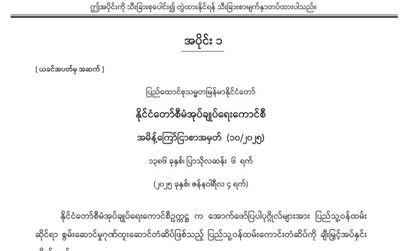 အပိုင်း (၁) တွင် နိုင်ငံတော်စီမံအုပ်ချုပ်ရေးကောင်စီ အမိန့်ကြော်ငြာစာ၊ ပြည်ထောင်စု တရားလွှတ်တော်ချုပ် အမိန့်ကြော်ငြာစာ၊ နိုင်ငံတော်ဖွဲ့စည်းပုံအခြေခံဥပဒေဆိုင်ရာခုံရုံး အမိန့်ကြော်ငြာစာ၊ ခရီးသွားလုပ်ငန်းကော်မတီ အမိန့်ကြော်ငြာစာ၊ ပို့ဆောင်ရေးနှင့် ဆက်သွယ်ရေးဝန်ကြီးဌာန (ဝန်ကြီးရုံး) အမိန့်ကြော်ငြာစာ၊ ကာကွယ်ရေးဝန်ကြီးဌာန (ဝန်ကြီးရုံး) အမိန့်ကြော်ငြာစာ၊ ပြည်ထဲရေးဝန်ကြီးဌာန အမိန့်ကြော်ငြာစာ၊ စီမံကိန်းနှင့် ဘဏ္ဍာရေးဝန်ကြီးဌာန အမိန့်ကြော်ငြာစာ၊ ရင်းနှီးမြှုပ်နှံမှုနှင့် နိုင်ငံခြားစီးပွားဆက်သွယ်ရေး ဝန်ကြီးဌာန အမိန့်ကြော်ငြာစာ၊ ရင်းနှီးမြှုပ်နှံမှုနှင့် နိုင်ငံခြားစီးပွားဆက်သွယ်ရေးဝန်ကြီးဌာန တင်ဒါကော်မတီ အမိန့်ကြော်ငြာစာ၊ ပြန်ကြားရေးဝန်ကြီးဌာန (ဝန်ကြီးရုံး) အမိန့် ကြော်ငြာစာ၊ စိုက်ပျိုးရေး၊ မွေးမြူရေးနှင့် ဆည်မြောင်းဝန်ကြီးဌာန (ပြည်ထောင်စုဝန်ကြီးရုံး) အမိန့်ကြော်ငြာစာ၊ စီးပွားရေးနှင့် ကူးသန်းရောင်းဝယ်ရေးဝန်ကြီးဌာန (ပြည်ထောင်စု ဝန်ကြီးရုံး) အမိန့်ကြော်ငြာစာ၊ ပညာရေးဝန်ကြီးဌာန (ဝန်ကြီးရုံး) အမိန့်ကြော်ငြာစာ၊ ကျန်းမာရေးဝန်ကြီးဌာန (ဝန်ကြီးရုံး) အမိန့်ကြော်ငြာစာ၊ ဆောက်လုပ်ရေးဝန်ကြီးဌာန (ပြည်ထောင်စုဝန်ကြီးရုံး) အမိန့်ကြော်ငြာစာ၊ တိုင်းရင်းသားလူမျိုးများရေးရာဝန်ကြီးဌာန (ပြည်ထောင်စုဝန်ကြီးရုံး) အမိန့်ကြော်ငြာစာ၊ မွန်ပြည်နယ်အစိုးရအဖွဲ့ အမိန့်ကြော်ငြာစာတို့ ပါဝင်ပါသည်။
