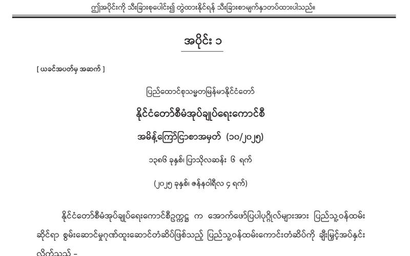 အပိုင်း (၁) တွင် နိုင်ငံတော်စီမံအုပ်ချုပ်ရေးကောင်စီ အမိန့်ကြော်ငြာစာ၊ ပြည်ထောင်စု အစိုးရအဖွဲ့ အမိန့်ကြော်ငြာစာ၊ ပြည်ထောင်စုတရားလွှတ်တော်ချုပ် အမိန့်ကြော်ငြာစာ၊ ပုဂ္ဂလိကလုံခြုံရေးဝန်ဆောင်မှု ကြီးကြပ်ကွပ်ကဲရေးဗဟိုကော်မတီ အမိန့်ကြော်ငြာစာ၊ ခရီးသွားလုပ်ငန်းကော်မတီ အမိန့်ကြော်ငြာစာ၊ ပို့ဆောင်ရေးနှင့် ဆက်သွယ်ရေးဝန်ကြီးဌာန (ဝန်ကြီးရုံး) အမိန့်ကြော်ငြာစာ၊ ပြည်ထဲရေးဝန်ကြီးဌာန အမိန့်ကြော်ငြာစာ၊ ပြန်ကြားရေး ဝန်ကြီးဌာန အမိန့်ကြော်ငြာစာ၊ စိုက်ပျိုးရေး၊ မွေးမြူရေးနှင့် ဆည်မြောင်းဝန်ကြီးဌာန (ပြည်ထောင်စုဝန်ကြီးရုံး) အမိန့်ကြော်ငြာစာ၊ လျှပ်စစ်စွမ်းအားဝန်ကြီးဌာန အမိန့် ကြော်ငြာစာ၊ စီးပွားရေးနှင့် ကူးသန်းရောင်းဝယ်ရေးဝန်ကြီးဌာန (ပြည်ထောင်စုဝန်ကြီးရုံး) အမိန့်ကြော်ငြာစာ၊ ပညာရေးဝန်ကြီးဌာန (ဝန်ကြီးရုံး) အမိန့်ကြော်ငြာစာ၊ လူမှုဝန်ထမ်း၊ ကယ်ဆယ်ရေးနှင့် ပြန်လည်နေရာချထားရေးဝန်ကြီးဌာန (ဝန်ကြီးရုံး) အမိန့်ကြော်ငြာစာ၊ တိုင်းရင်းသားလူမျိုးများရေးရာဝန်ကြီးဌာန (ပြည်ထောင်စု ဝန်ကြီးရုံး) အမိန့်ကြော်ငြာစာ၊ ပြည်ထောင်စုစာရင်းစစ်ချုပ်ရုံး အမိန့်ကြော်ငြာစာ၊ မြန်မာနိုင်ငံတော်ဗဟိုဘဏ် အမိန့် ကြော်ငြာစာ၊ ရန်ကုန်တိုင်းဒေသကြီးအစိုးရအဖွဲ့ ရန်ကုန်မြို့တော်စည်ပင်သာယာရေး ကော်မတီ အမိန့်ကြော်ငြာစာတို့ ပါဝင်ပါသည်။