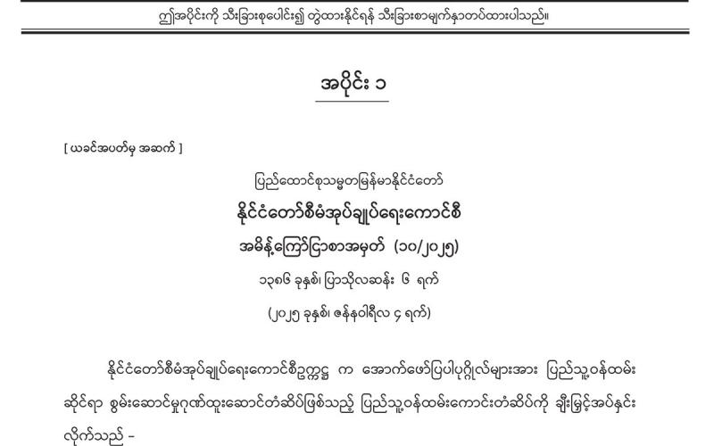 အပိုင်း (၁) တွင် နိုင်ငံတော်စီမံအုပ်ချုပ်ရေးကောင်စီ အမိန့်ကြော်ငြာစာ၊ ပို့ဆောင်ရေးနှင့် ဆက်သွယ်ရေးဝန်ကြီးဌာန (ဝန်ကြီးရုံး) အမိန့်ကြော်ငြာစာ၊ ပြည်ထဲရေးဝန်ကြီးဌာန အမိန့်ကြော်ငြာစာ၊ စီမံကိန်းနှင့် ဘဏ္ဍာရေးဝန်ကြီးဌာန အမိန့်ကြော်ငြာစာ၊ နိုင်ငံခြားရေး ဝန်ကြီးဌာန အမိန့်ကြော်ငြာစာ၊ ရင်းနှီးမြှုပ်နှံမှုနှင့် နိုင်ငံခြားစီးပွားဆက်သွယ်ရေးဝန်ကြီးဌာန တင်ဒါကော်မတီ အမိန့်ကြော်ငြာစာ၊ ပြန်ကြားရေးဝန်ကြီးဌာန (ဝန်ကြီးရုံး) အမိန့် ကြော်ငြာစာ၊ စိုက်ပျိုးရေး၊ မွေးမြူရေးနှင့် ဆည်မြောင်းဝန်ကြီးဌာန (ပြည်ထောင်စုဝန်ကြီးရုံး) အမိန့်ကြော်ငြာစာ၊ အလုပ်သမားဝန်ကြီးဌာန အမိန့်ကြော်ငြာစာတို့ ပါဝင်ပါသည်။