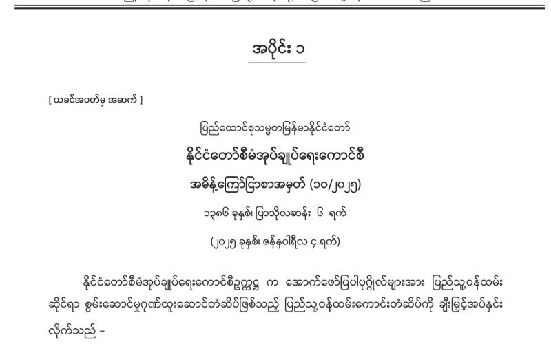 အပိုင်း (၁) တွင် နိုင်ငံတော်စီမံအုပ်ချုပ်ရေးကောင်စီ အမိန့်ကြော်ငြာစာ၊ ပြည်ထောင်စု တရားလွှတ်တော်ချုပ် အမိန့်ကြော်ငြာစာ၊ ခရီးသွားလုပ်ငန်းကော်မတီ အမိန့်ကြော်ငြာစာ၊ ပြည်ထဲရေးဝန်ကြီးဌာန (ဝန်ကြီးရုံး) အမိန့်ကြော်ငြာစာ၊ နိုင်ငံခြားရေးဝန်ကြီးဌာန အမိန့် ကြော်ငြာစာ၊ နယ်စပ်ရေးရာဝန်ကြီးဌာန (ဝန်ကြီးရုံး) အမိန့်ကြော်ငြာစာ၊ စိုက်ပျိုးရေး၊ မွေးမြူရေးနှင့် ဆည်မြောင်းဝန်ကြီးဌာန (ပြည်ထောင်စုဝန်ကြီးရုံး) အမိန့်ကြော်ငြာစာ၊ လျှပ်စစ်စွမ်းအားဝန်ကြီးဌာန အမိန့်ကြော်ငြာစာ၊ စီးပွားရေးနှင့် ကူးသန်းရောင်းဝယ်ရေး ဝန်ကြီးဌာန (ပြည်ထောင်စုဝန်ကြီးရုံး) အမိန့်ကြော်ငြာစာ၊ ပညာရေးဝန်ကြီးဌာန (ဝန်ကြီးရုံး) အမိန့်ကြော်ငြာစာ၊ ကျန်းမာရေးဝန်ကြီးဌာန (ဝန်ကြီးရုံး) အမိန့်ကြော်ငြာစာ၊ ပြည်ထောင်စု ရာထူးဝန်အဖွဲ့ အမိန့်ကြော်ငြာစာ၊ မြန်မာနိုင်ငံတော်ဗဟိုဘဏ် အမိန့်ကြော်ငြာစာတို့ ပါဝင်ပါ သည်။