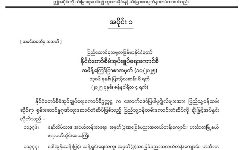 အပိုင်း (၁) တွင် နိုင်ငံတော်စီမံအုပ်ချုပ်ရေးကောင်စီ အမိန့်ကြော်ငြာစာ၊ အမျိုးသား ကာကွယ်ရေး နှင့် လုံခြုံရေးကောင်စီရုံး အမိန့်ကြော်ငြာစာ၊ ပြည်ထောင်စုအစိုးရအဖွဲ့ အမိန့်ကြော်ငြာစာ၊ အမျိုးသားအဆင့် လျှပ်စစ်သုံးယာဉ်နှင့် ဆက်စပ်လုပ်ငန်းများ ဖွံ့ဖြိုးတိုးတက်ရေး ဦးဆောင် ကော်မတီ အမိန့်ကြော်ငြာစာ၊ အမျိုးသားစီမံကိန်းဝန်ကြီးဌာန အမိန့်ကြော်ငြာစာ၊ ပို့ဆောင်ရေး နှင့် ဆက်သွယ်ရေးဝန်ကြီးဌာန (ဝန်ကြီးရုံး) အမိန့်ကြော်ငြာစာ၊ နိုင်ငံခြားရေးဝန်ကြီးဌာန အမိန့်ကြော်ငြာစာ၊ ပြည်ထဲရေးဝန်ကြီးဌာန (ဝန်ကြီးရုံး) အမိန့်ကြော်ငြာစာ၊ နယ်စပ်ရေးရာ ဝန်ကြီးဌာန (ဝန်ကြီးရုံး) အမိန့်ကြော်ငြာစာ၊ တိုင်းရင်းသားလူမျိုးများရေးရာဝန်ကြီးဌာန (ပြည် ထောင်စုဝန်ကြီးရုံး) အမိန့်ကြော်ငြာစာ၊ ပြန်ကြားရေးဝန်ကြီးဌာန အမိန့်ကြော်ငြာစာ၊ စိုက်ပျိုးရေး၊ မွေးမြူရေးနှင့် ဆည်မြောင်းဝန်ကြီးဌာန (ပြည်ထောင်စုဝန်ကြီးရုံး) အမိန့်ကြော်ငြာစာ၊ သယံဇာတ နှင့် သဘာဝပတ်ဝန်းကျင် ထိန်းသိမ်းရေးဝန်ကြီးဌာန (ပြည်ထောင်စုဝန်ကြီးရုံး) အမိန့် ကြော်ငြာစာ၊ အလုပ်သမားဝန်ကြီးဌာန အမိန့်ကြော်ငြာစာ၊ စီးပွားရေးနှင့် ကူးသန်းရောင်းဝယ်ရေး ဝန်ကြီးဌာန (ပြည်ထောင်စုဝန်ကြီးရုံး) အမိန့်ကြော်ငြာစာ၊ ပညာရေးဝန်ကြီးဌာန (ဝန်ကြီးရုံး) အမိန့်ကြော်ငြာစာ၊ ဆောက်လုပ်ရေးဝန်ကြီးဌာန အမိန့်ကြော်ငြာစာ၊ ပြည်ထောင်စုရာထူးဝန်အဖွဲ့ အမိန့်ကြော်ငြာစာ၊ နေပြည်တော်စည်ပင်သာယာရေးကော်မတီ အမိန့်ကြော်ငြာစာ၊ ရန်ကုန်တိုင်း ဒေသကြီးအစိုးရအဖွဲ့ ရန်ကုန်မြို့တော်စည်ပင်သာယာရေးကော်မတီ အမိန့်ကြော်ငြာစာတို့ ပါဝင်ပါသည်။