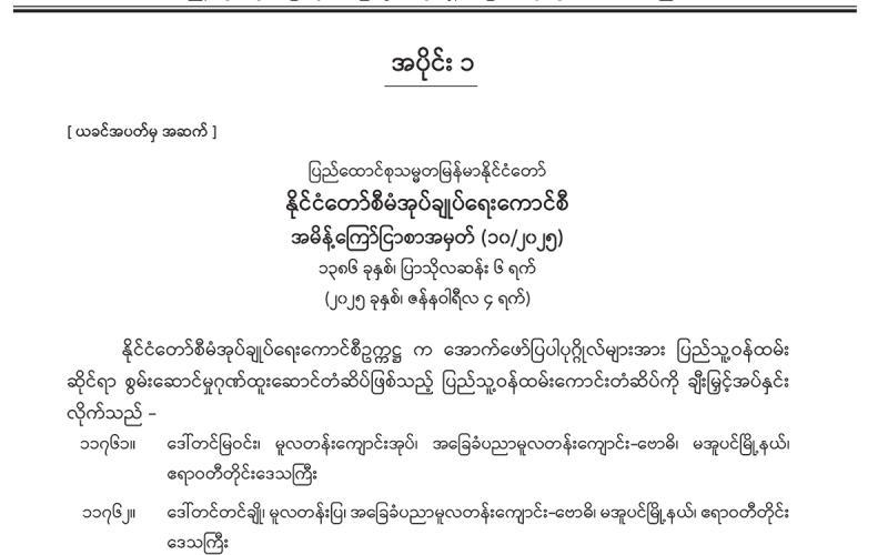 အပိုင်း (၁) တွင် နိုင်ငံတော်စီမံအုပ်ချုပ်ရေးကောင်စီ အမိန့်ကြော်ငြာစာ၊ အမျိုးသားကာကွယ်ရေး နှင့် လုံခြုံရေးကောင်စီရုံး အမိန့်ကြော်ငြာစာ၊ ပြည်ထောင်စုတရားလွှတ်တော်ချုပ် အမိန့် ကြော်ငြာစာ၊ ပြည်ထောင်စုရွေးကောက်ပွဲကော်မရှင် အမိန့်ကြော်ငြာစာ၊ အမျိုးသားစီမံကိန်း ဝန်ကြီးဌာန အမိန့်ကြော်ငြာစာ၊ ပို့ဆောင်ရေးနှင့်ဆက်သွယ်ရေးဝန်ကြီးဌာန (ဝန်ကြီးရုံး) အမိန့်ကြော်ငြာစာ၊ ကာကွယ်ရေးဝန်ကြီးဌာန (ဝန်ကြီးရုံး) အမိန့်ကြော်ငြာစာ၊ နိုင်ငံခြားရေး ဝန်ကြီးဌာန အမိန့်ကြော်ငြာစာ၊ ပြည်ထဲရေးဝန်ကြီးဌာန အမိန့်ကြော်ငြာစာ၊ နယ်စပ်ရေးရာ ဝန်ကြီးဌာန (ဝန်ကြီးရုံး) အမိန့်ကြော်ငြာစာ၊ ပြန်ကြားရေးဝန်ကြီးဌာန (ဝန်ကြီးရုံး) အမိန့် ကြော်ငြာစာ၊ သာသနာရေးနှင့် ယဉ်ကျေးမှုဝန်ကြီးဌာန (ဝန်ကြီးရုံး) အမိန့်ကြော်ငြာစာ၊ စိုက်ပျိုးရေး၊ မွေးမြူရေးနှင့်ဆည်မြောင်းဝန်ကြီးဌာန (ပြည်ထောင်စုဝန်ကြီးရုံး) အမိန့် ကြော်ငြာစာ၊ လျှပ်စစ်စွမ်းအားဝန်ကြီးဌာန အမိန့်ကြော်ငြာစာ၊ ပညာရေးဝန်ကြီးဌာန (ဝန်ကြီးရုံး) အမိန့်ကြော်ငြာစာ၊ ပြည်ထောင်စုရာထူးဝန်အဖွဲ့ အမိန့်ကြော်ငြာစာတို့ ပါဝင်ပါသည်။