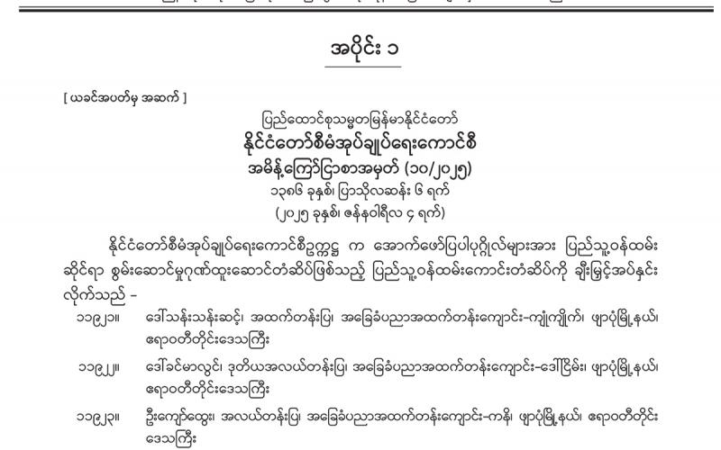 အပိုင်း (၁) တွင် နိုင်ငံတော်စီမံအုပ်ချုပ်ရေးကောင်စီ အမိန့်ကြော်ငြာစာ၊ အမျိုးသားကာကွယ်ရေး နှင့် လုံခြုံရေးကောင်စီရုံး အမိန့်ကြော်ငြာစာ၊ အမျိုးသားစီမံကိန်းဝန်ကြီးဌာန အမိန့်ကြော်ငြာစာ၊ နိုင်ငံတော်သမ္မတရုံး ဝန်ကြီးဌာန(၄) အမိန့်ကြော်ငြာစာ၊ ပို့ဆောင်ရေးနှင့် ဆက်သွယ်ရေး ဝန်ကြီးဌာန (ဝန်ကြီးရုံး) အမိန့်ကြော်ငြာစာ၊ နိုင်ငံခြားရေးဝန်ကြီးဌာန အမိန့်ကြော်ငြာစာ၊ ပြည်ထဲရေးဝန်ကြီးဌာန (ဝန်ကြီးရုံး) အမိန့်ကြော်ငြာစာ၊ စိုက်ပျိုးရေး၊ မွေးမြူရေးနှင့် ဆည်မြောင်း ဝန်ကြီးဌာန (ပြည်ထောင်စုဝန်ကြီးရုံး) အမိန့်ကြော်ငြာစာ၊ အားကစားနှင့် လူငယ်ရေးရာ ဝန်ကြီးဌာန အမိန့်ကြော်ငြာစာ၊ ဟိုတယ်နှင့် ခရီးသွားလာရေးဝန်ကြီးဌာန (ဝန်ကြီးရုံး) အမိန့်ကြော်ငြာစာ၊ ပြည်ထောင်စုရာထူးဝန်အဖွဲ့ အမိန့်ကြော်ငြာစာ၊ မွန်ပြည်နယ်အစိုးရအဖွဲ့ အမိန့်ကြော်ငြာစာတို့ ပါဝင်ပါသည်။