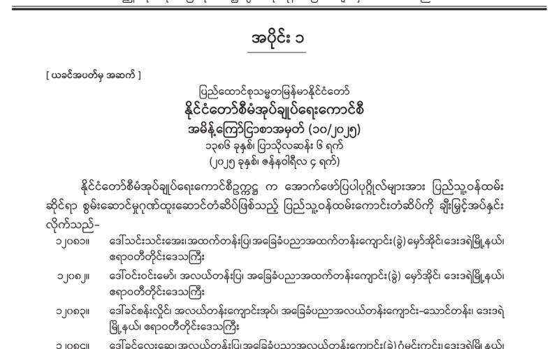 အပိုင်း (၁) တွင် နိုင်ငံတော်စီမံအုပ်ချုပ်ရေးကောင်စီ အမိန့်ကြော်ငြာစာ၊ အမျိုးသားကာကွယ် ရေးနှင့် လုံခြုံရေးကောင်စီရုံး အမိန့်ကြော်ငြာစာ၊ ပြည်ထောင်စုအစိုးရအဖွဲ့ အမိန့် ကြော်ငြာစာ၊ ပြည်ထောင်စုရွေးကောက်ပွဲကော်မရှင် အမိန့်ကြော်ငြာစာ၊ အမျိုးသားအဆင့် လျှပ်စစ်သုံးယာဉ်နှင့် ဆက်စပ်လုပ်ငန်းများ ဖွံ့ဖြိုးတိုးတက်ရေး ဦးဆောင်ကော်မတီ အမိန့် ကြော်ငြာစာ၊ အမျိုးသားစီမံကိန်းဝန်ကြီးဌာန အမိန့်ကြော်ငြာစာ၊ ဘဏ္ဍာရေးနှင့် အခွန် ဝန်ကြီးဌာန အမိန့်ကြော်ငြာစာ၊ နိုင်ငံခြားရေးဝန်ကြီးဌာန အမိန့်ကြော်ငြာစာ၊ ပြည်ထဲရေး ဝန်ကြီးဌာန အမိန့်ကြော်ငြာစာ၊ နယ်စပ်ရေးရာဝန်ကြီးဌာန (ဝန်ကြီးရုံး) အမိန့်ကြော်ငြာစာ၊ သာသနာရေးနှင့် ယဉ်ကျေးမှုဝန်ကြီးဌာန အမိန့်ကြော်ငြာစာ၊ စိုက်ပျိုးရေး၊ မွေးမြူရေးနှင့် ဆည်မြောင်းဝန်ကြီးဌာန (ပြည်ထောင်စုဝန်ကြီးရုံး) အမိန့်ကြော်ငြာစာ၊ စီးပွားရေးနှင့် ကူးသန်းရောင်းဝယ်ရေးဝန်ကြီးဌာန (ပြည်ထောင်စုဝန်ကြီးရုံး) အမိန့်ကြော်ငြာစာ၊ ဟိုတယ် နှင့် ခရီးသွားလာရေးဝန်ကြီးဌာန (ဝန်ကြီးရုံး) အမိန့်ကြော်ငြာစာ၊ ပြည်ထောင်စု ရာထူးဝန်အဖွဲ့ အမိန့်ကြော်ငြာစာ၊ မြန်မာနိုင်ငံတော်ဗဟိုဘဏ် အမိန့်ကြော်ငြာစာ၊ မွန်ပြည်နယ်အစိုးရအဖွဲ့ အမိန့်ကြော်ငြာစာတို့ ပါဝင်ပါသည်။