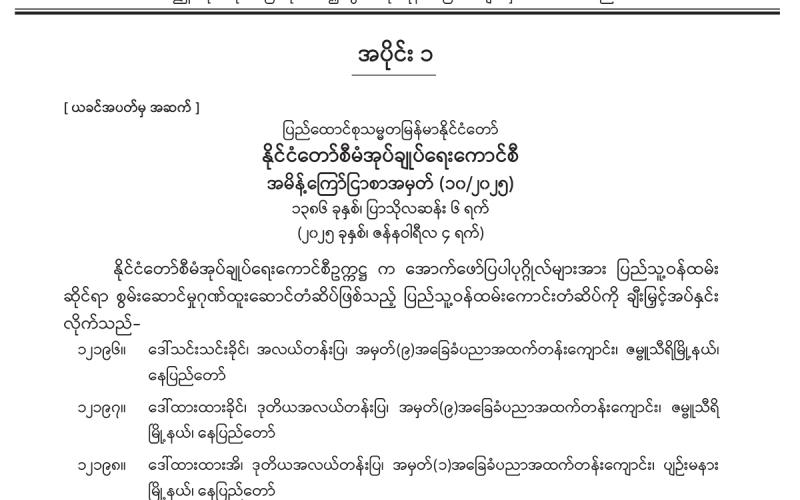 အပိုင်း (၁) တွင် နိုင်ငံတော်စီမံအုပ်ချုပ်ရေးကောင်စီ အမိန့်ကြော်ငြာစာ၊ အမျိုးသားကာကွယ် ရေးနှင့် လုံခြုံရေးကောင်စီရုံး အမိန့်ကြော်ငြာစာ၊ ပြည်ထောင်စုတရားလွှတ်တော်ချုပ် အမိန့်ကြော်ငြာစာ၊ အမျိုးသားအဆင့် လျှပ်စစ်သုံးယာဉ်နှင့် ဆက်စပ်လုပ်ငန်းများ ဖွံ့ဖြိုးတိုးတက်ရေးဦးဆောင်ကော်မတီ အမိန့်ကြော်ငြာစာ၊ အကြမ်းဖက်မှုတိုက်ဖျက်ရေး ဗဟိုအဖွဲ့ အမိန့်ကြော်ငြာစာ၊ အမျိုးသားစီမံကိန်းဝန်ကြီးဌာန အမိန့်ကြော်ငြာစာ၊ ပို့ဆောင် ရေးနှင့် ဆက်သွယ်ရေးဝန်ကြီးဌာန (ဝန်ကြီးရုံး) အမိန့်ကြော်ငြာစာ၊ ဘဏ္ဍာရေးနှင့် အခွန်ဝန်ကြီးဌာန အမိန့်ကြော်ငြာစာ၊ ပြည်ထဲရေးဝန်ကြီးဌာန အမိန့်ကြော်ငြာစာ၊ ပြန်ကြားရေးဝန်ကြီးဌာန အမိန့်ကြော်ငြာစာ၊ သာသနာရေးနှင့် ယဉ်ကျေးမှုဝန်ကြီးဌာန (ဝန်ကြီးရုံး) အမိန့်ကြော်ငြာစာ၊ စိုက်ပျိုးရေး၊ မွေးမြူရေးနှင့် ဆည်မြောင်းဝန်ကြီးဌာန (ပြည်ထောင်စုဝန်ကြီးရုံး) အမိန့်ကြော်ငြာစာ၊ စီးပွားရေးနှင့် ကူးသန်းရောင်းဝယ်ရေး ဝန်ကြီးဌာန (ပြည်ထောင်စုဝန်ကြီးရုံး) အမိန့်ကြော်ငြာစာ၊ ပညာရေးဝန်ကြီးဌာန (ဝန်ကြီးရုံး) အမိန့်ကြော်ငြာစာ၊ သိပ္ပံနှင့် နည်းပညာဝန်ကြီးဌာန (ဝန်ကြီးရုံး) အမိန့်ကြော်ငြာစာ၊ ဟိုတယ်နှင့် ခရီးသွားလာရေးဝန်ကြီးဌာန (ဝန်ကြီးရုံး) အမိန့်ကြော်ငြာစာ၊ ဆောက်လုပ်ရေး ဝန်ကြီးဌာန အမိန့်ကြော်ငြာစာ၊ မြန်မာနိုင်ငံတော်ဗဟိုဘဏ် အမိန့်ကြော်ငြာစာတို့ ပါဝင်ပါ သည်။