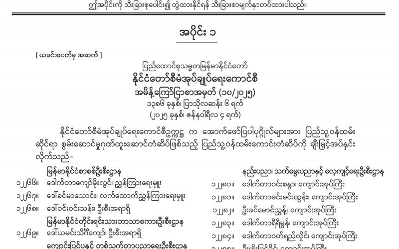 အပိုင်း (၁) တွင် နိုင်ငံတော်စီမံအုပ်ချုပ်ရေးကောင်စီ အမိန့်ကြော်ငြာစာ၊ အမျိုးသားကာကွယ် ရေးနှင့် လုံခြုံရေးကောင်စီရုံး အမိန့်ကြော်ငြာစာ၊ ပြည်ထောင်စုတရားလွှတ်တော်ချုပ် အမိန့်ကြော်ငြာစာ၊ အမျိုးသားကာကွယ်ရေးနှင့် လုံခြုံရေးကောင်စီ ကုန်သွယ်မှုနှင့် ကုန်စည်စီးဆင်းမှုများ မှန်ကန်မြန်ဆန်စေရေးဗဟိုကော်မတီ အမိန့်ကြော်ငြာစာ၊ အမျိုးသား အဆင့် လျှပ်စစ်သုံးယာဉ်နှင့် ဆက်စပ်လုပ်ငန်းများ ဖွံ့ဖြိုးတိုးတက်ရေး ဦးဆောင်ကော်မတီ အမိန့်ကြော်ငြာစာ၊ ပို့ဆောင်ရေးနှင့် ဆက်သွယ်ရေးဝန်ကြီးဌာန (ဝန်ကြီးရုံး) အမိန့် ကြော်ငြာစာ၊ ဘဏ္ဍာရေးနှင့် အခွန်ဝန်ကြီးဌာန အမိန့်ကြော်ငြာစာ၊ နိုင်ငံခြားရေးဝန်ကြီးဌာန အမိန့်ကြော်ငြာစာ၊ ပြည်ထဲရေးဝန်ကြီးဌာန အမိန့်ကြော်ငြာစာ၊ နယ်စပ်ရေးရာဝန်ကြီးဌာန (ဝန်ကြီးရုံး) အမိန့်ကြော်ငြာစာ၊ ရင်းနှီးမြှုပ်နှံမှုနှင့် နိုင်ငံခြားစီးပွားဆက်သွယ်ရေးဝန်ကြီးဌာန အမိန့်ကြော်ငြာစာ၊ ပြန်ကြားရေးဝန်ကြီးဌာန အမိန့်ကြော်ငြာစာ၊ သာသနာရေးနှင့် ယဉ်ကျေးမှုဝန်ကြီးဌာန အမိန့်ကြော်ငြာစာ၊ စိုက်ပျိုးရေး၊ မွေးမြူရေးနှင့် ဆည်မြောင်း ဝန်ကြီးဌာန (ပြည်ထောင်စုဝန်ကြီးရုံး) အမိန့်ကြော်ငြာစာ၊ လျှပ်စစ်စွမ်းအားဝန်ကြီးဌာန အမိန့်ကြော်ငြာစာ၊ စက်မှုဝန်ကြီးဌာန အမိန့်ကြော်ငြာစာ၊ ဟိုတယ်နှင့် ခရီးသွားလာရေး ဝန်ကြီးဌာန (ဝန်ကြီးရုံး) အမိန့်ကြော်ငြာစာ၊ ဆောက်လုပ်ရေးဝန်ကြီးဌာန (ပြည်ထောင်စု ဝန်ကြီးရုံး) အမိန့်ကြော်ငြာစာ၊ နေပြည်တော်စည်ပင်သာယာရေးကော်မတီ အမိန့် ကြော်ငြာစာတို့ ပါဝင်ပါသည်။