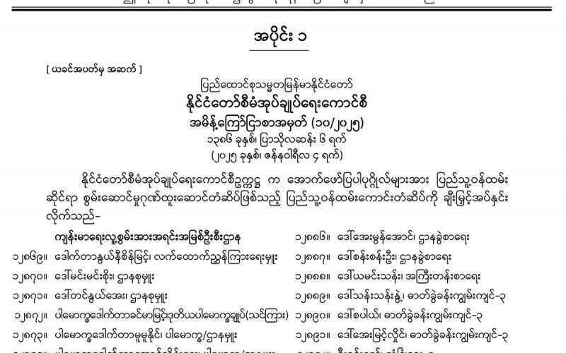 အပိုင်း (၁) တွင် နိုင်ငံတော်စီမံအုပ်ချုပ်ရေးကောင်စီ အမိန့်ကြော်ငြာစာ၊ အမျိုးသားကာကွယ် ရေးနှင့် လုံခြုံရေးကောင်စီရုံး အမိန့်ကြော်ငြာစာ၊ ပြည်ထောင်စုတရားလွှတ်တော်ချုပ် အမိန့်ကြော်ငြာစာ၊ ပုဂ္ဂလိကပိုင်ပြုလုပ်ရေးကော်မရှင် အမိန့်ကြော်ငြာစာ၊ မြေလွတ်၊ မြေလပ် နှင့် မြေရိုင်းများ စီမံခန့်ခွဲရေးဗဟိုကော်မတီ အမိန့်ကြော်ငြာစာ၊ ပို့ဆောင်ရေးနှင့် ဆက်သွယ်ရေးဝန်ကြီးဌာန (ဝန်ကြီးရုံး) အမိန့်ကြော်ငြာစာ၊ နိုင်ငံခြားရေးဝန်ကြီးဌာန အမိန့်ကြော်ငြာစာ၊ ပြည်ထဲရေးဝန်ကြီးဌာန အမိန့်ကြော်ငြာစာ၊ နယ်စပ်ရေးရာဝန်ကြီးဌာန (ဝန်ကြီးရုံး) အမိန့်ကြော်ငြာစာ၊ ရင်းနှီးမြှုပ်နှံမှုနှင့် နိုင်ငံခြားစီးပွားဆက်သွယ်ရေးဝန်ကြီးဌာန အမိန့်ကြော်ငြာစာ၊ စိုက်ပျိုးရေး၊ မွေးမြူရေးနှင့် ဆည်မြောင်းဝန်ကြီးဌာန (ပြည်ထောင်စု ဝန်ကြီးရုံး) အမိန့်ကြော်ငြာစာတို့ ပါဝင်ပါသည်။