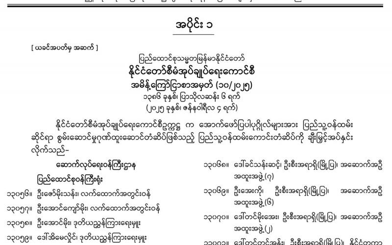 အပိုင်း (၁) တွင် နိုင်ငံတော်စီမံအုပ်ချုပ်ရေးကောင်စီ အမိန့်ကြော်ငြာစာ၊ အမျိုးသားကာကွယ် ရေးနှင့် လုံခြုံရေးကောင်စီရုံး အမိန့်ကြော်ငြာစာ၊ ပြည်ထောင်စုတရားလွှတ်တော်ချုပ် အမိန့်ကြော်ငြာစာ၊ ပြည်ထောင်စုရွေးကောက်ပွဲကော်မရှင် အမိန့်ကြော်ငြာစာ၊ နိုင်ငံခြားသား အမြဲနေထိုင်ခွင့်ပြုခြင်းဆိုင်ရာ အကောင်အထည်ဖော်ရေးဗဟိုကော်မတီ အမိန့်ကြော်ငြာစာ၊ ဗဟိုလယ်ယာမြေစီမံခန့်ခွဲမှုအဖွဲ့ အမိန့်ကြော်ငြာစာ၊ ပို့ဆောင်ရေးနှင့် ဆက်သွယ်ရေးဝန်ကြီး ဌာန (ဝန်ကြီးရုံး) အမိန့်ကြော်ငြာစာ၊ ဘဏ္ဍာရေးနှင့် အခွန်ဝန်ကြီးဌာန အမိန့်ကြော်ငြာစာ၊ နိုင်ငံခြားရေးဝန်ကြီးဌာန အမိန့်ကြော်ငြာစာ၊ ပြည်ထဲရေးဝန်ကြီးဌာန (ဝန်ကြီးရုံး) အမိန့် ကြော်ငြာစာ၊ နယ်စပ်ရေးရာဝန်ကြီးဌာန (ဝန်ကြီးရုံး) အမိန့်ကြော်ငြာစာ၊ ပြန်ကြားရေး ဝန်ကြီးဌာန (ဝန်ကြီးရုံး) အမိန့်ကြော်ငြာစာ၊ စိုက်ပျိုးရေး၊ မွေးမြူရေးနှင့် ဆည်မြောင်း ဝန်ကြီးဌာန (ပြည်ထောင်စုဝန်ကြီးရုံး) အမိန့်ကြော်ငြာစာ၊ စက်မှုဝန်ကြီးဌာန အမိန့် ကြော်ငြာစာ၊ ဆောက်လုပ်ရေးဝန်ကြီးဌာန အမိန့်ကြော်ငြာစာ၊ ရန်ကုန်တိုင်းဒေသကြီး အစိုးရအဖွဲ့ ရန်ကုန်မြို့တော်စည်ပင်သာယာရေးကော်မတီ အမိန့်ကြော်ငြာစာတို့ ပါဝင်ပါသည်။