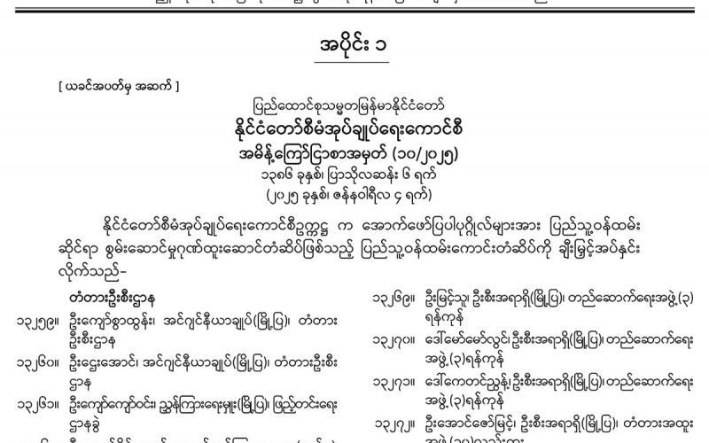 အပိုင်း (၁) တွင် နိုင်ငံတော်စီမံအုပ်ချုပ်ရေးကောင်စီ အမိန့်ကြော်ငြာစာ၊ အမျိုးသားကာကွယ် ရေးနှင့် လုံခြုံရေးကောင်စီရုံး အမိန့်ကြော်ငြာစာ၊ ပြည်ထောင်စုသမ္မတမြန်မာနိုင်ငံတော် ပြည်ထောင်စုအစိုးရအဖွဲ့ရုံး (၇၈) နှစ်မြောက် လွတ်လပ်ရေးနေ့ကျင်းပရေးဗဟိုကော်မတီ အမိန့်ကြော်ငြာစာ၊ ပြည်ထောင်စုတရားလွှတ်တော်ချုပ် အမိန့်ကြော်ငြာစာ၊ ဗဟို လယ်ယာမြေစီမံခန့်ခွဲမှုအဖွဲ့ အမိန့်ကြော်ငြာစာ၊ ဘဏ္ဍာရေးနှင့် အခွန်ဝန်ကြီးဌာန အမိန့် ကြော်ငြာစာ၊ နိုင်ငံခြားရေးဝန်ကြီးဌာန အမိန့်ကြော်ငြာစာ၊ ပြည်ထဲရေးဝန်ကြီးဌာန (ဝန်ကြီးရုံး) အမိန့်ကြော်ငြာစာ၊ နယ်စပ်ရေးရာ ဝန်ကြီးဌာန (ဝန်ကြီးရုံး) အမိန့်ကြော်ငြာစာ၊ လျှပ်စစ်စွမ်းအားဝန်ကြီးဌာန အမိန့်ကြော်ငြာစာ၊ ဆောက်လုပ်ရေးဝန်ကြီးဌာန အမိန့် ကြော်ငြာစာ၊ ပြည်ထောင်စုစာရင်းစစ်ချုပ်ရုံး အမိန့်ကြော်ငြာစာ၊ နေပြည်တော်စည်ပင် သာယာရေးကော်မတီ အမိန့်ကြော်ငြာစာတို့ ပါဝင်ပါသည်။