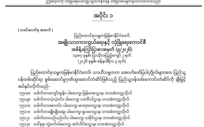 အပိုင်း (၁) တွင် အမျိုးသားကာကွယ်ရေးနှင့် လုံခြုံရေးကောင်စီရုံး အမိန့်ကြော်ငြာစာ၊ ပြည်ထောင်စုတရားလွှတ်တော်ချုပ် အမိန့်ကြော်ငြာစာ၊ ခရီးသွားလုပ်ငန်းကော်မတီ အမိန့် ကြော်ငြာစာ၊ မြန်မာနိုင်ငံကလေးအလုပ်သမားပပျောက်ရေးဆိုင်ရာအမျိုးသားကော်မတီ အမိန့်ကြော်ငြာစာ၊ ပြည်ထဲရေးဝန်ကြီးဌာန အမိန့်ကြော်ငြာစာ၊ ပြန်ကြားရေးဝန်ကြီးဌာန (ဝန်ကြီးရုံး) အမိန့်ကြော်ငြာစာ၊ သယံဇာတနှင့် သဘာဝပတ်ဝန်းကျင်ထိန်းသိမ်းရေး ဝန်ကြီး ဌာန အမိန့်ကြော်ငြာစာ၊ စီးပွားရေးနှင့် ကူးသန်းရောင်းဝယ်ရေးဝန်ကြီးဌာန အမိန့် ကြော်ငြာစာ၊ ပညာရေးဝန်ကြီးဌာန (ဝန်ကြီးရုံး) အမိန့်ကြော်ငြာစာ၊ ဆောက်လုပ်ရေး ဝန်ကြီးဌာန (ပြည်ထောင်စုဝန်ကြီးရုံး) အမိန့်ကြော်ငြာစာ၊ ပြည်ထောင်စုရာထူးဝန်အဖွဲ့ အမိန့်ကြော်ငြာစာ၊ နေပြည်တော်စည်ပင်သာယာရေးကော်မတီ အမိန့်ကြော်ငြာစာ၊ မြန်မာနိုင်ငံတော်ဗဟိုဘဏ် အမိန့်ကြော်ငြာစာတို့ ပါဝင်ပါသည်။