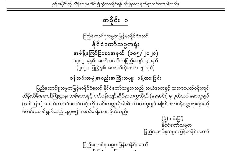 အပိုင်း (၁) တွင် နိုင်ငံတော်သမ္မတရုံး အမိန့်ကြော်ငြာစာ၊ ပြည်ထောင်စုအစိုးရအဖွဲ့ အမိန့်ကြော်ငြာစာ၊ ပြည်ထောင်စုလွှတ်တော်ရုံး အမိန့်ကြော်ငြာစာ၊ ပြည်ထောင်စု တရားလွှတ်တော်ချုပ် အမိန့်ကြော်ငြာစာ၊ ပြည်ထောင်စုရွေးကောက်ပွဲကော်မရှင် ကြေညာချက်၊ ပြည်ထောင်စုရွေးကောက်ပွဲကော်မရှင် အမိန့်ကြော်ငြာစာ၊ အဂတိလိုက်စားမှု တိုက်ဖျက်ရေး ကော်မရှင် အမိန့်ကြော်ငြာစာ၊