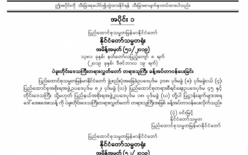 အပိုင်း (၁) တွင် နိုင်ငံတော်သမ္မတရုံး အမိန့်ကြော်ငြာစာ၊ ပြည်ထောင်စုလွှတ်တော်ရုံး အမိန့်ကြော်ငြာစာ၊ ပြည်သူ့လွှတ်တော် ကြေညာချက်၊ အမျိုးသားလွှတ်တော်ကြေညာချက်၊ ပြည်ထောင်စုတရား လွှတ်တော်ချုပ် အမိန့်ကြော်ငြာစာ၊ ပြည်ထောင်စုရွေးကောက်ပွဲကော်မရှင် ကြေညာချက်၊ မသန်စွမ်းသူများ၏ အခွင့်အရေးများဆိုင်ရာ အမျိုးသားကော်မတီ အမိန့်ကြော်ငြာစာ၊ အမျိုးသားခရီးသွားလုပ်ငန်း ဖွံ့ဖြိုးတိုးတက်ရေးဗဟိုကော်မတီ အမိန့်ကြော်ငြာစာ၊ ပြည်ထဲရေးဝန်ကြီးဌာန (ဝန်ကြီးရုံး) အမိန့်ကြော်ငြာစာ၊ စိုက်ပျိုးရေး၊ မွေးမြူရေးနှင့် ဆည်မြောင်းဝန်ကြီးဌာန (ဝန်ကြီးရုံး) အမိန့်ကြော်ငြာစာ၊ သယံဇာတနှင့် သဘာဝပတ်ဝန်းကျင်ထိန်းသိမ်းရေးဝန်ကြီးဌာန (ပြည်ထောင်စုဝန်ကြီးရုံး) အမိန့်ကြော်ငြာစာ၊ ပညာရေးဝန်ကြီးဌာန (ဝန်ကြီးရုံး) အမိန့်ကြော်ငြာစာ၊ စီမံကိန်း၊ ဘဏ္ဍာရေးနှင့် စက်မှုဝန်ကြီးဌာန (ပြည်ထောင်စုဝန်ကြီးရုံး) အမိန့်ကြော်ငြာစာ၊ ဆောက်လုပ်ရေးဝန်ကြီးဌာန အမိန့်ကြော်ငြာစာ၊ လူမှုဝန်ထမ်း၊ ကယ်ဆယ်ရေးနှင့် ပြန်လည်နေရာချထားရေး ဝန်ကြီးဌာန (ဝန်ကြီးရုံး) အမိန့်ကြော်ငြာစာ၊ တိုင်းရင်းသားလူမျိုးများရေးရာဝန်ကြီးဌာန (ပြည်ထောင်စုဝန်ကြီးရုံး) အမိန့်ကြော်ငြာစာ၊ ပြည်ထောင်စုရာထူးဝန်အဖွဲ့ အမိန့်ကြော်ငြာစာ၊ ရန်ကုန်တိုင်းဒေသကြီးအစိုးရ ရန်ကုန်မြို့တော် စည်ပင်သာယာရေးကော်မတီ အမိန့်ကြော်ငြာစာ၊