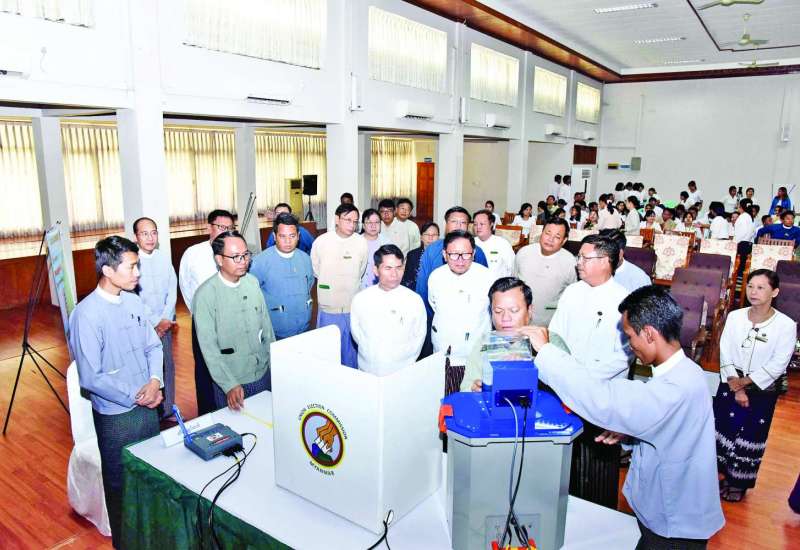 ပြည်ထောင်စုရွေးကောက်ပွဲကော်မရှင်က မြန်မာအီလက်ထရွန်နစ် မဲပေးစက်နှင့်စပ်လျဉ်းပြီး ရှင်းလင်းပြသခြင်းနှင့် လက်တွေ့သရုပ်ပြစမ်းသပ်မဲပေးခြင်းကို ယနေ့နံနက်ပိုင်းတွင် စိုက်ပျိုးရေး၊ မွေးမြူရေးနှင့်ဆည်မြောင်းဝန်ကြီးဌာန အစည်းအဝေးခန်းမနှင့် မွန်းလွဲပိုင်းတွင် နိုင်ငံခြားရေးဝန်ကြီးဌာန အစည်းအဝေးခန်းမတို့၌ ကျင်းပသည်။
