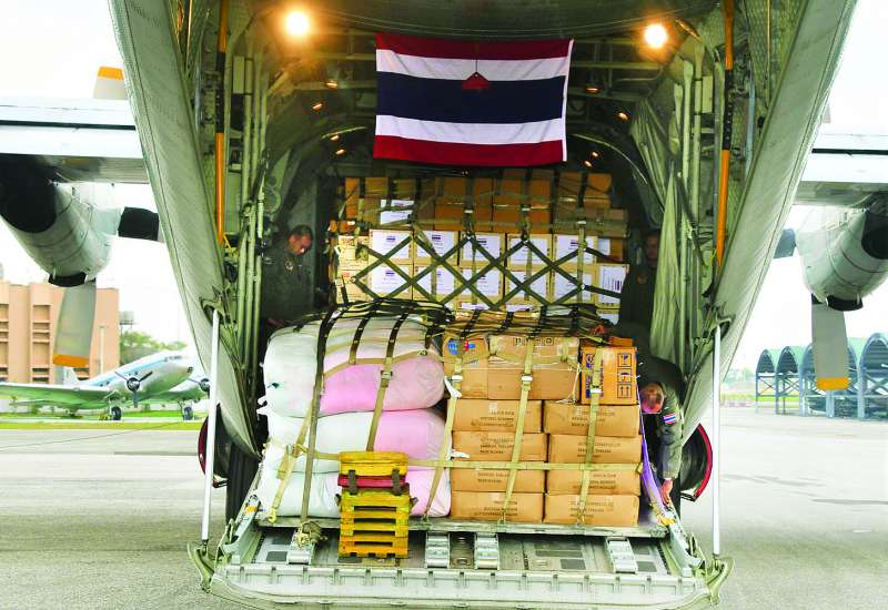 ထိုင်းနိုင်ငံဘုရင်မင်းမြတ် His Majesty King Maha Vajiralong-korn Phra Vajiraklaochaoyuhua နှင့် မိဖုရား Her Majesty Queen Suthida Bajrasudhabimala-lakshana ၊ ထိုင်းနိုင်ငံအစိုးရ၊ ထိုင်းကြက်ခြေနီအသင်း၊ ထိုင်း-မြန်မာချစ်ကြည်ရေးအသင်း၊ ထိုင်းပုဂ္ဂလိကကဏ္ဍနှင့် ထိုင်းပြည်သူများမှ မိုခါမုန်တိုင်းဒဏ်သင့်ဒေသရှိ ပြည်သူများထံသို့ ပေးပို့လှူဒါန်းသည့် ယာယီတဲများနှင့် အမိုးအကာများ၊ ဆိုလာမီးအိမ်များ၊ ကယ်ဆယ်ရေးအိတ်များ၊ ဆေးစိမ်ခြင်ထောင်များ၊ ငါးသေတ္တာများနှင့် အသင့်စားခေါက်ဆွဲခြောက်များ သယ်ဆောင်လာသည့် ထိုင်းတော်ဝင်လေတပ်မှ C - 130 လေယာဉ်နှစ်စင်းသည် မေ ၂၃ ရက် နံနက်ပိုင်းတွင် ရန်ကုန်လေဆိပ်သို့ ဆိုက်ရောက်ခဲ့သည်။