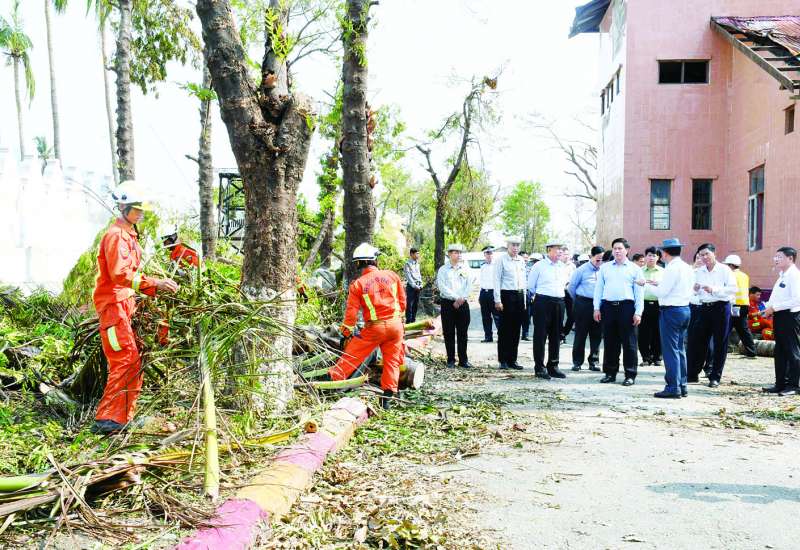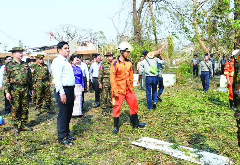 နိုင်ငံတော်စီမံအုပ်ချုပ်ရေးကောင်စီအဖွဲ့ဝင် ဒုတိယဝန်ကြီးချုပ်နှင့် ပြည်ထောင်စုဝန်ကြီး ဗိုလ်ချုပ်ကြီး တင်အောင်စန်းသည် ပြည်ထောင်စုဝန်ကြီး ဒုတိယဗိုလ်ချုပ်ကြီး ထွန်းထွန်းနောင်၊ ရခိုင်ပြည်နယ်ဝန်ကြီးချုပ် ဦးထိန်လင်းတို့နှင့်အတူ ယနေ့နံနက်ပိုင်းက စစ်တွေမြို့အတွင်း မုန်တိုင်းဒဏ်ကြောင့် ထိခိုက်ပျက်စီးခဲ့သည့် အပျက်အစီးများအား ပူးပေါင်းအဖွဲ့များဖြင့် ရှင်းလင်းဖယ်ရှားနေမှုကို လိုက်လံကြည့်ရှုစစ်ဆေးပြီး လိုအပ်သည်များကို ဖြည့်ဆည်း ဆောင်ရွက်ပေးသည်။
