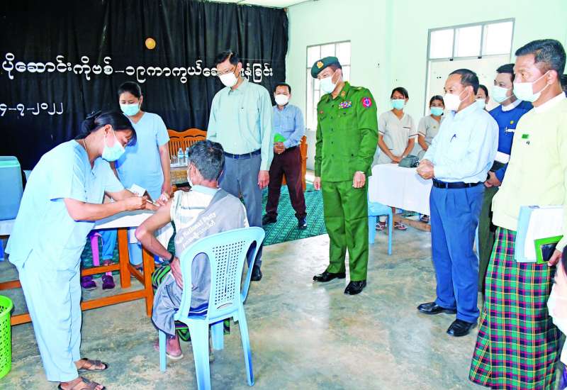 စစ်ကိုင်းတိုင်းဒေသကြီး နာဂ ကိုယ်ပိုင်အုပ်ချုပ်ခွင့်ရဒေသ လဟယ်မြို့သို့ ရောက်ရှိနေသော နိုင်ငံတော်စီမံအုပ်ချုပ်ရေး ကောင်စီအဖွဲ့ဝင် ကာကွယ်ရေးဝန်ကြီးဌာန ပြည်ထောင်စုဝန်ကြီး ဗိုလ်ချုပ်ကြီး မြထွန်းဦး၊ တိုင်း ဒေသကြီးဝန်ကြီးချုပ် ဦးမြတ်ကျော်၊ အနောက်မြောက်တိုင်း စစ်ဌာနချုပ် တိုင်းမှူး ဗိုလ်မှူးချုပ် သန်းထိုက်နှင့် တာဝန်ရှိသူများသည် ဇူလိုင် ၁၄ ရက် နံနက်ပိုင်းတွင် လဟယ်မြို့ရှိ နယ်မြေခံတပ်ရင်းခန်းမ၌ အရာရှိ၊ စစ်သည်၊ မိသားစုဝင်များအား တွေ့ဆုံအမှာစကားပြောကြားပြီး တပ်နယ်မိသားစုများအတွက် စားသောက်ဖွယ်ရာများနှင့် ကိုဗစ်-၁၉ ရောဂါကာကွယ်ရေး အထောက်အကူပြုပစ္စည်းများ ပေးအပ်သည်။
