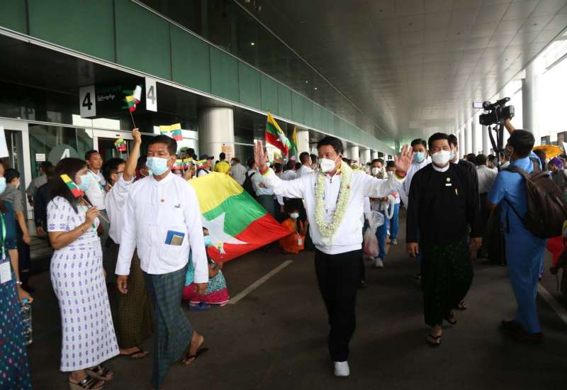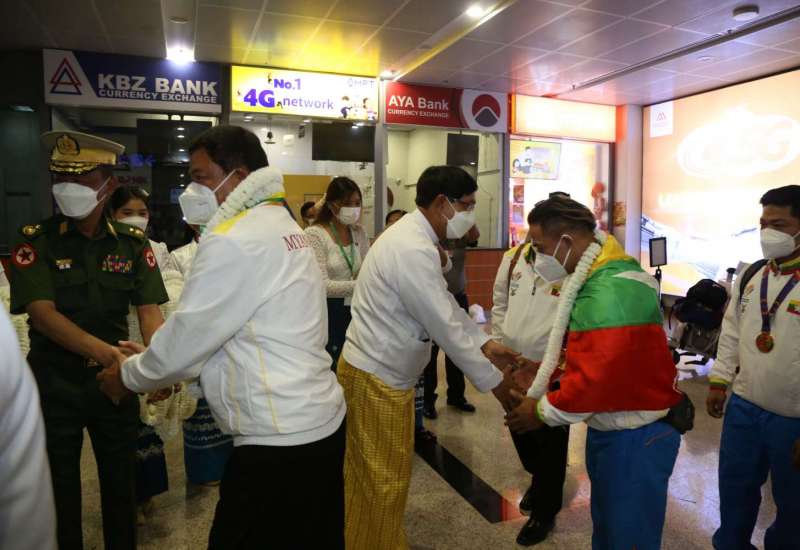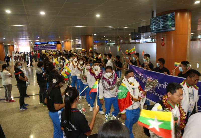 ဗီယက်နမ်နိုင်ငံ၊ ဟနွိုင်းမြို့နှင့် အခြားဆက်စပ်မြို့များတွင် မေ (၁၂)ရက်မှ (၂၃)ရက်အထိ ကျင်းပပြုလုပ်နေသည့် (၃၁)ကြိမ်မြောက် အရှေ့တောင်အာရှ အားကစားပြိုင်ပွဲတွင် ဝင်ရောက်ယှဉ်ပြိုင်ခဲ့သော မြန်မာအားကစားသမားအဖွဲ့သည် ယနေ့ညနေ ၄ နာရီတွင် ရန်ကုန်အပြည်ပြည်ဆိုင်ရာလေဆိပ်သို့ မြန်မာ့လေကြောင်း စင်းလုံးငှားလေယာဉ်ဖြင့် ပြန်လည်ရောက်ရှိလာရာ ရန်ကုန်တိုင်းဒေသကြီး အစိုးရအဖွဲ့ဝန်ကြီးချုပ် ဦးစိုးသိန်း၊ ရန်ကုန်တိုင်းဒေသကြီး စစ်ဌာနချုပ်တိုင်းမှူး ဗိုလ်ချုပ် ညွန့်ဝင်းဆွေ၊ ရန်ကုန်တိုင်းဒေသကြီး အစိုးရအဖွဲ့ဝင်ဝန်ကြီးများ၊ အားကစားနှင့်လူငယ်ရေးရာဝန်ကြီးဌာနမှ တာဝန်ရှိပုဂ္ဂိုလ်များ၊ မြန်မာနိုင်ငံ အားကစားအဖွဲ့ချုပ်များမှ ဥက္ကဋ္ဌများ၊ အနုပညာရှင်များ၊ ပြိုင်ပွဲဝင် အားကစားသမားများ၏ မိဘဆွေမျိုးများ၊ ဆရာ/ ဆရာမများနှင့် ကျောင်းသား/ ကျောင်းသူများ၊ မိဘပြည်သူများက အိုးစည်၊ ဒိုးပတ်များ၊ ပန်းစည်းများဖြင့် သောင်းသောင်းဖျဖျ ဂုဏ်ပြုကြိုဆိုကြသည်။