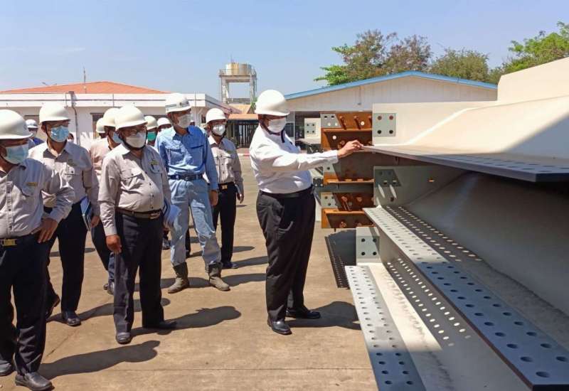 ဆောက်လုပ်ရေးဝန်ကြီးဌာန၊ ပြည်ထောင်စုဝန်ကြီး ဦးရွှေလေးသည် ယနေ့ နံနက်ပိုင်းတွင် ရန်ကုန်တိုင်းဒေသကြီး သာကေတမြို့နယ်၊ ရှုခင်းသာမြို့ပတ်လမ်းပေါ်ရှိ ဆောက်လုပ်ရေးဝန်ကြီးဌာနနှင့် ဂျပန်နိုင်ငံ JFE Engineering Corporation တို့ ပူးပေါင်းဆောင်ရွက်သည့် J & M Steel Solutions Co., Ltd သို့ ရောက်ရှိရာ J & M Steel Solutions Co., Ltd မှ တာဝန်ရှိသူက စက်ရုံအတွင်း သံပေါင်ထုတ်လုပ်မှုကို လိုက်လံရှင်းလင်း ပြသသည်။ ယင်းနောက်ပြည်ထောင်စုဝန်ကြီးနှင့် အဖွဲ့သည် ဘင်္ဂလားဒေ့ရှ်နိုင်ငံသို့ပေးပို့မည့် တံတားသံပေါင်များ ထုတ်လုပ်ထားမှုကို ကြည့်ရှုစစ်ဆေးသည်။
