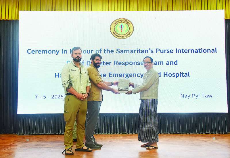 ကျန်းမာရေးဝန်ကြီးဌာန ပြည်ထောင်စုဝန်ကြီး ဒေါက်တာသက်ခိုင်ဝင်းသည် ယနေ့တွင် အမျိုးသားသဘာဝဘေးအန္တရာယ်စီမံခန့်ခွဲမှု ကော်မတီဥက္ကဋ္ဌ၏ကိုယ်စား အရေးပေါ်ကျန်းမာရေးစောင့်ရှောက်မှုလုပ်ငန်းများ ပြီးဆုံး၍ ပြန်လည်ထွက်ခွာမည့် အမေရိကန်အခြေစိုက် Samaritan’s Purse International Relief ဆေးအဖွဲ့အား ဂုဏ်ပြုနှုတ်ဆက်ပွဲနှင့် အရေးပေါ်ဆေးရုံ၊ ဆေးနှင့် ဆေးပစ္စည်းများ လှူဒါန်းပွဲအခမ်းအနားသို့ တက်ရောက်သည်။