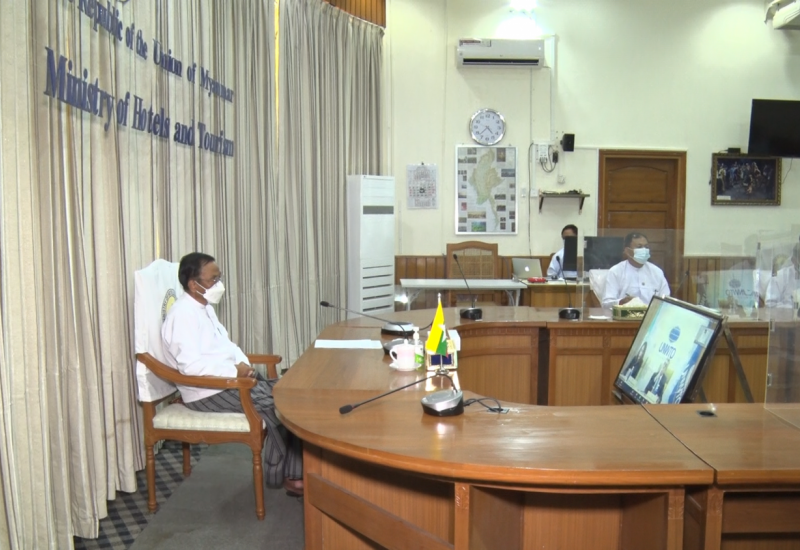 ဟိုတယ်နှင့်ခရီးသွားလာရေးဝန်ကြီးဌာန ပြည်ထောင်စုဝန်ကြီး ဒေါက်တာဌေးအောင်သည် ယနေ့နံနက်ပိုင်းတွင် ဝန်ကြီးဌာန၊ ကျောက်စိမ်းခန်းမ၌ Video Conferencing စနစ်ဖြင့် ကျင်းပ ပြုလုပ်သော “မြန်မာနိုင်ငံခရီးသွားလုပ်ငန်း ရေရှည်ဖွံ့ဖြိုးတိုးတက်ရေး စီမံချက်ရေးဆွဲရေးဆိုင်ရာ အလုပ်ရုံဆွေးနွေးပွဲ” သို့ တက်ရောက်သည်။